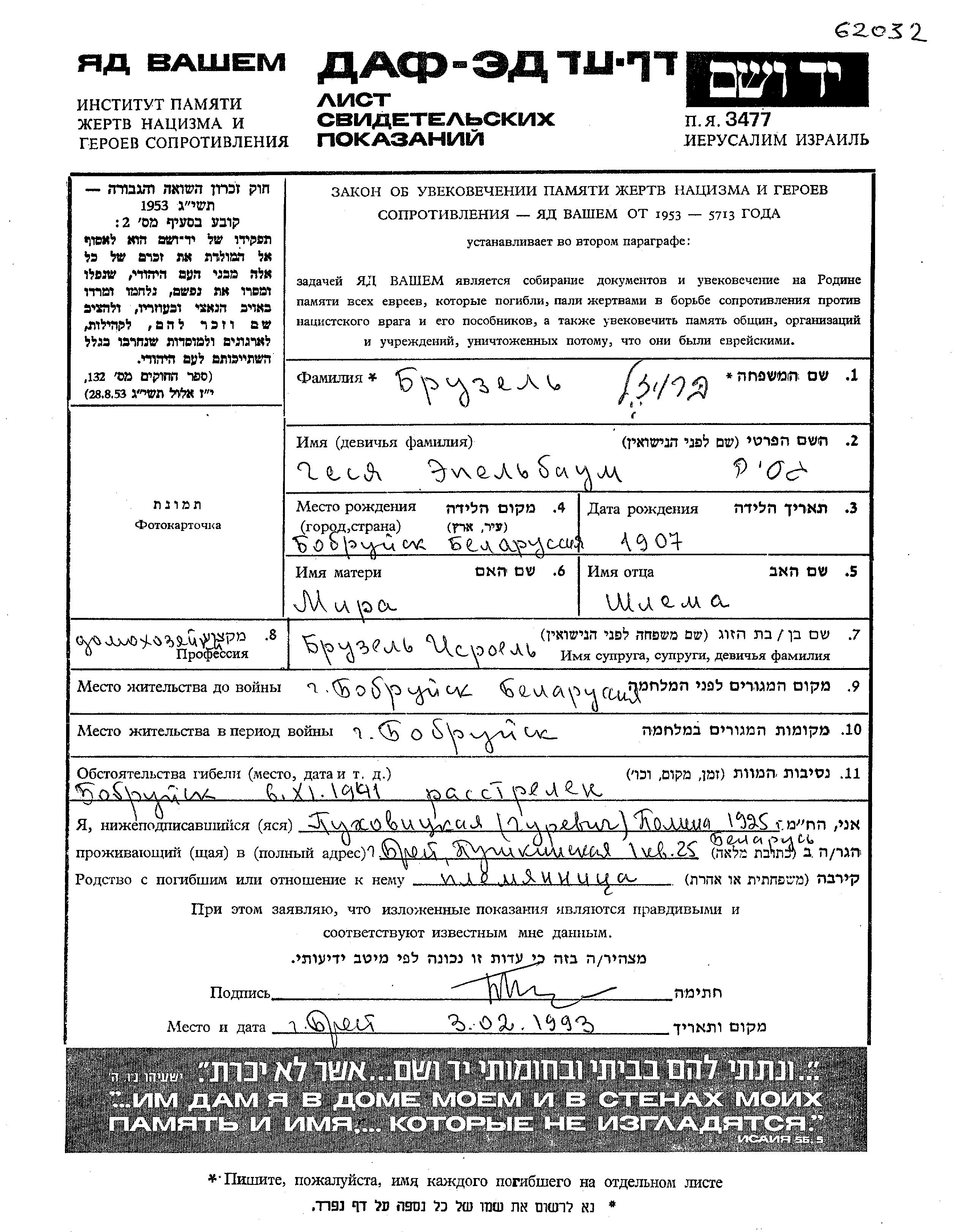 Bruzel Gesia 1907 Bobruysk, Bélorussie (URSS) Feuille de témoignage