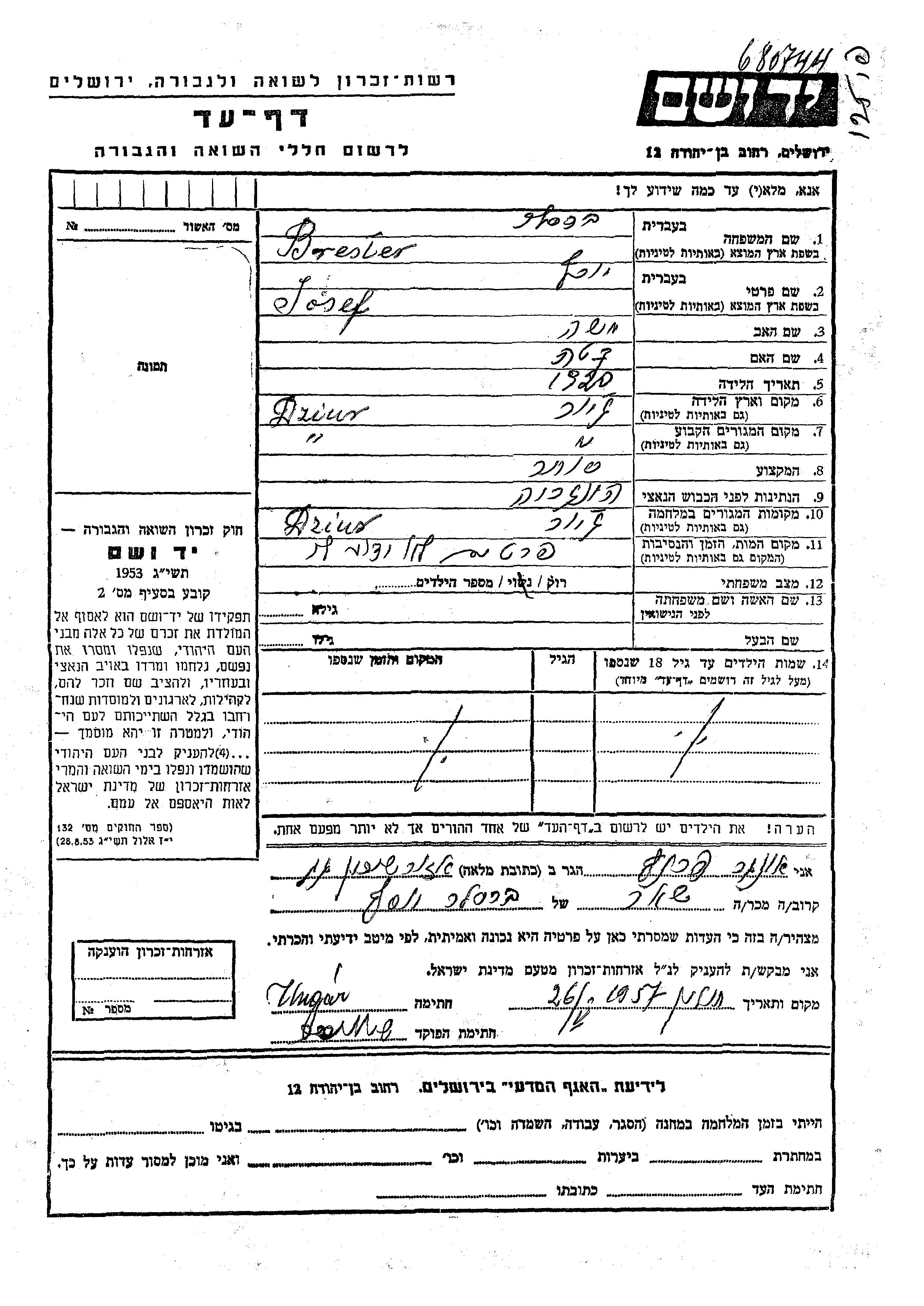 Bresler Josef 1920 Gyor, Hongrie Feuille de témoignage