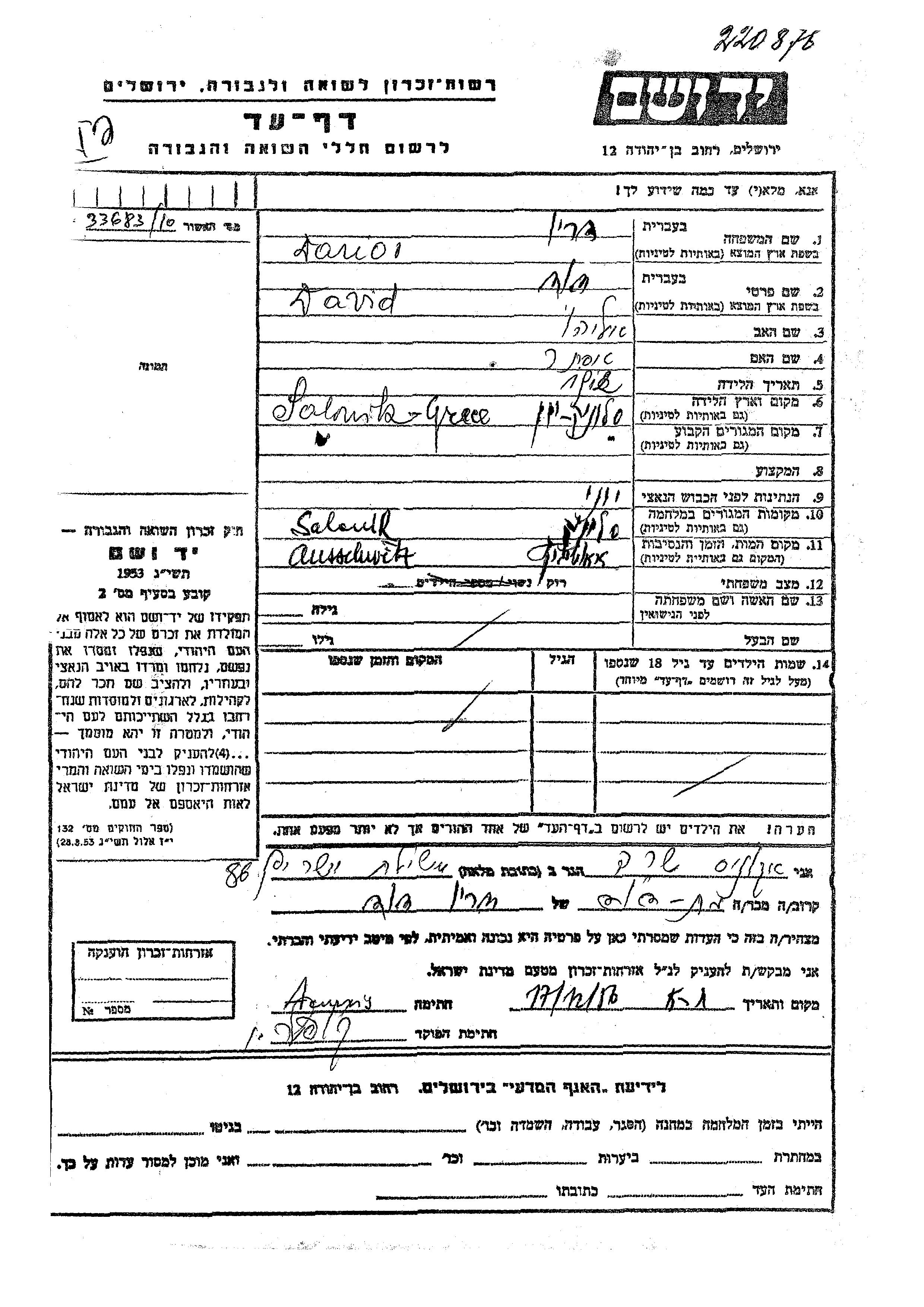 Dario David 1912 Saloniki, Grèce Feuille de témoignage