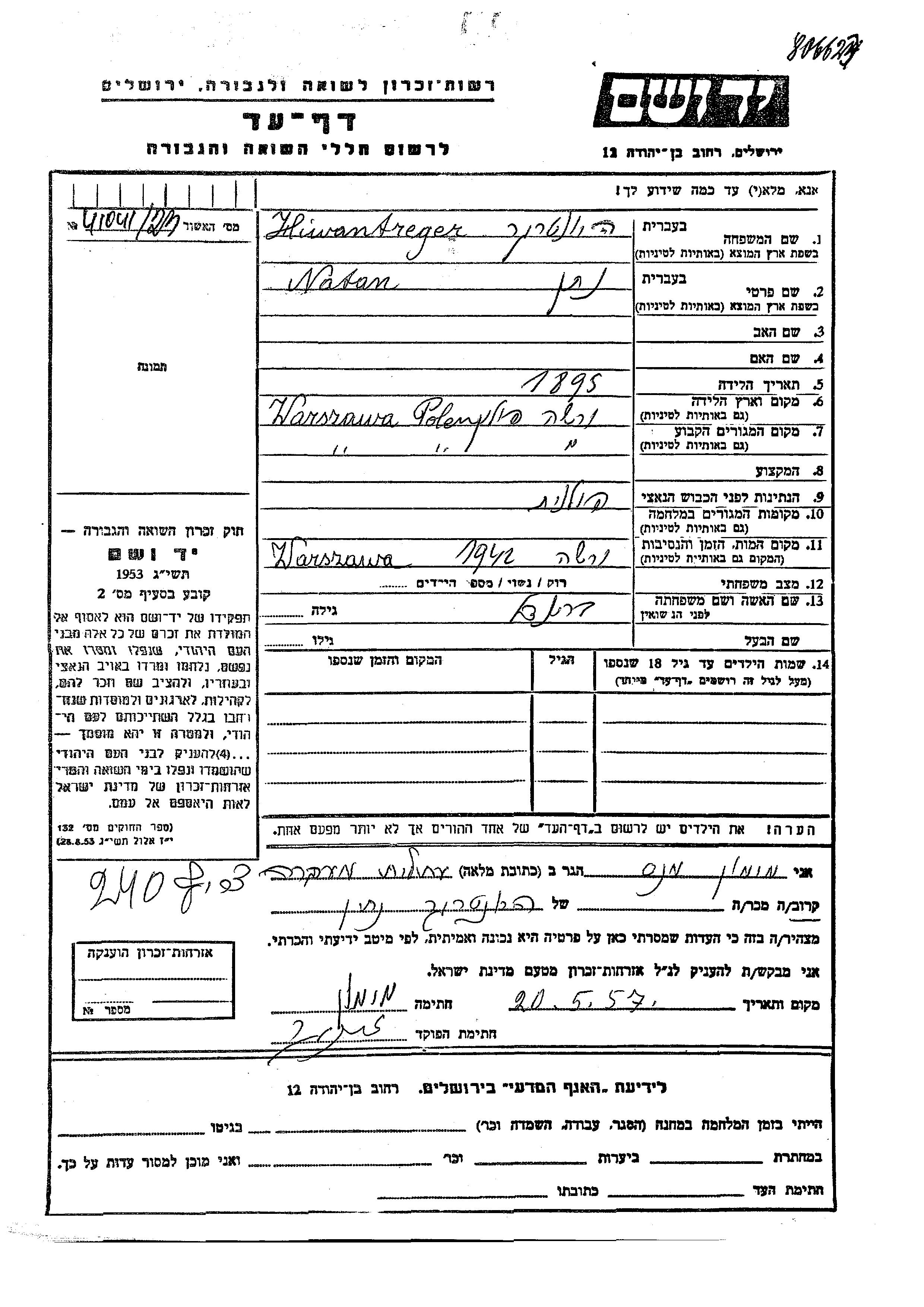 Natan Hiwantreger est né à Warszawa, Pologne en 1895. Il était Mariée à Breina. Avant la seconde guerre mondiale il vivait à Warszawa, Pologne.