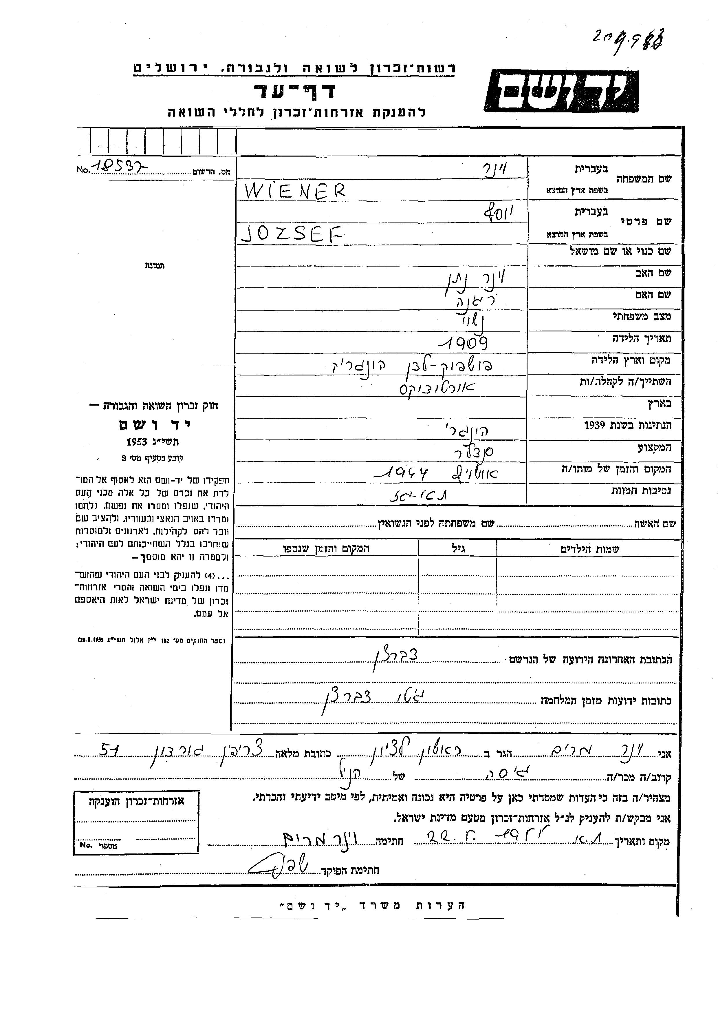 Jozsef Winer est né à S Gravenhage, Pays-Bas en 1909, fils de Natan et de Regina. Il était Cordonnier. Avant la seconde guerre mondiale il vivait à Debrecen, Hongrie. Au cours de la guerre, il était à Debrecen, Hongrie.
