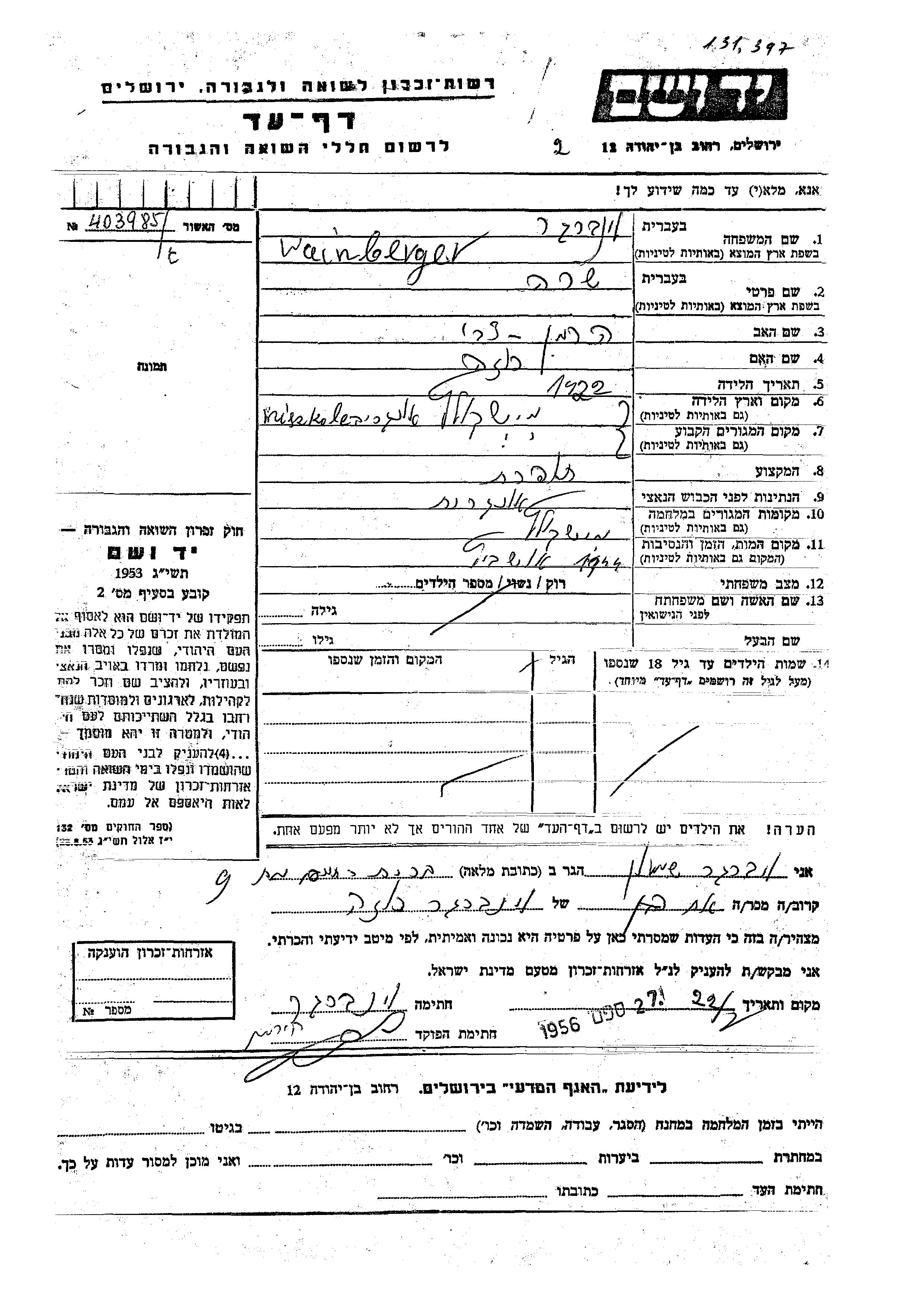 Wainberger Sara 1922 endroit inconnu, Feuille de témoignage