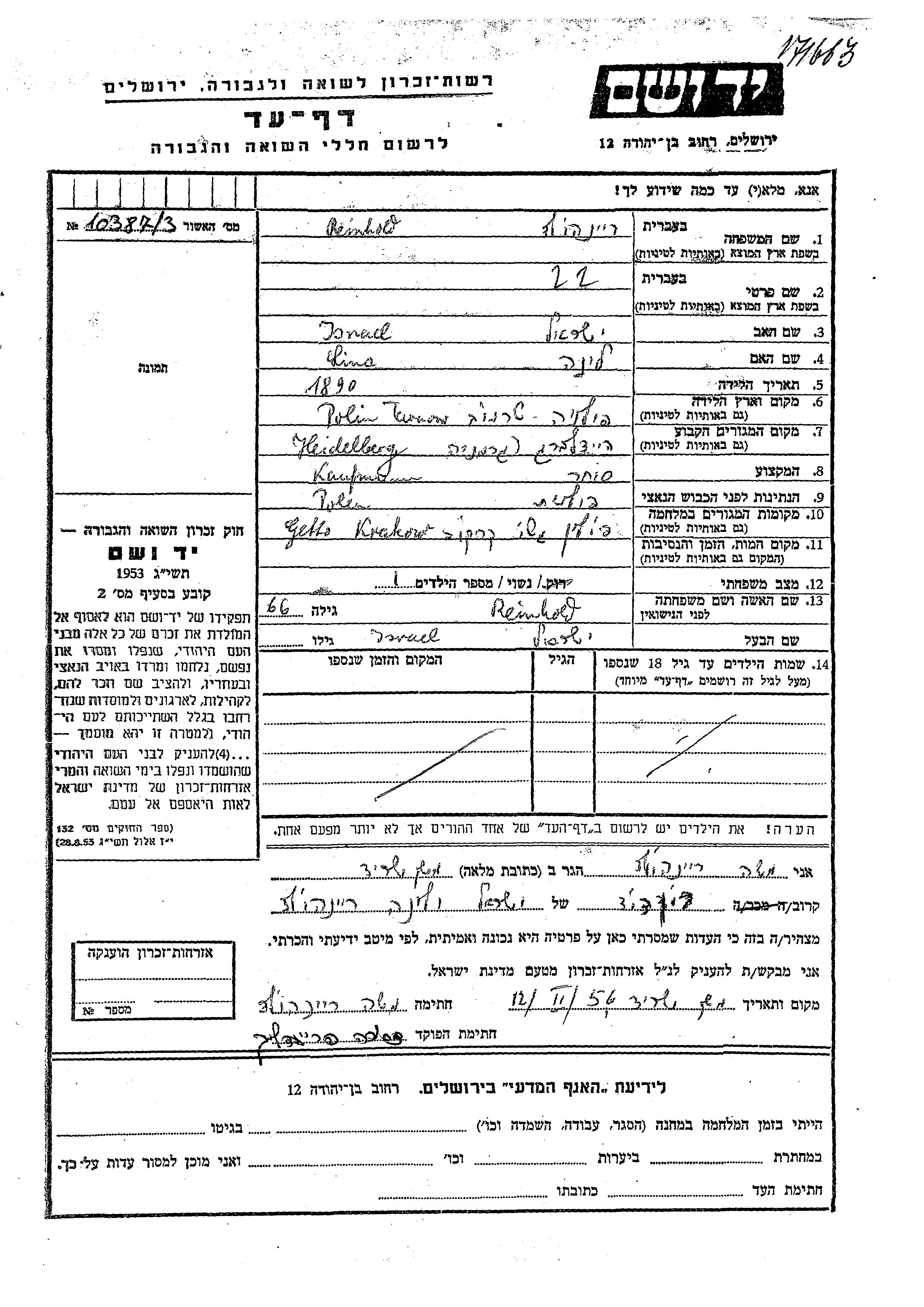 prénom inconnu Reinhold est né à Tarnow, Pologne en 1890, fils de Israel et de Lina. Il était Commerçant/e. Avant la seconde guerre mondiale il vivait à Heidelberg, Allemagne. Au cours de la guerre, il était à Krakow, Pologne.