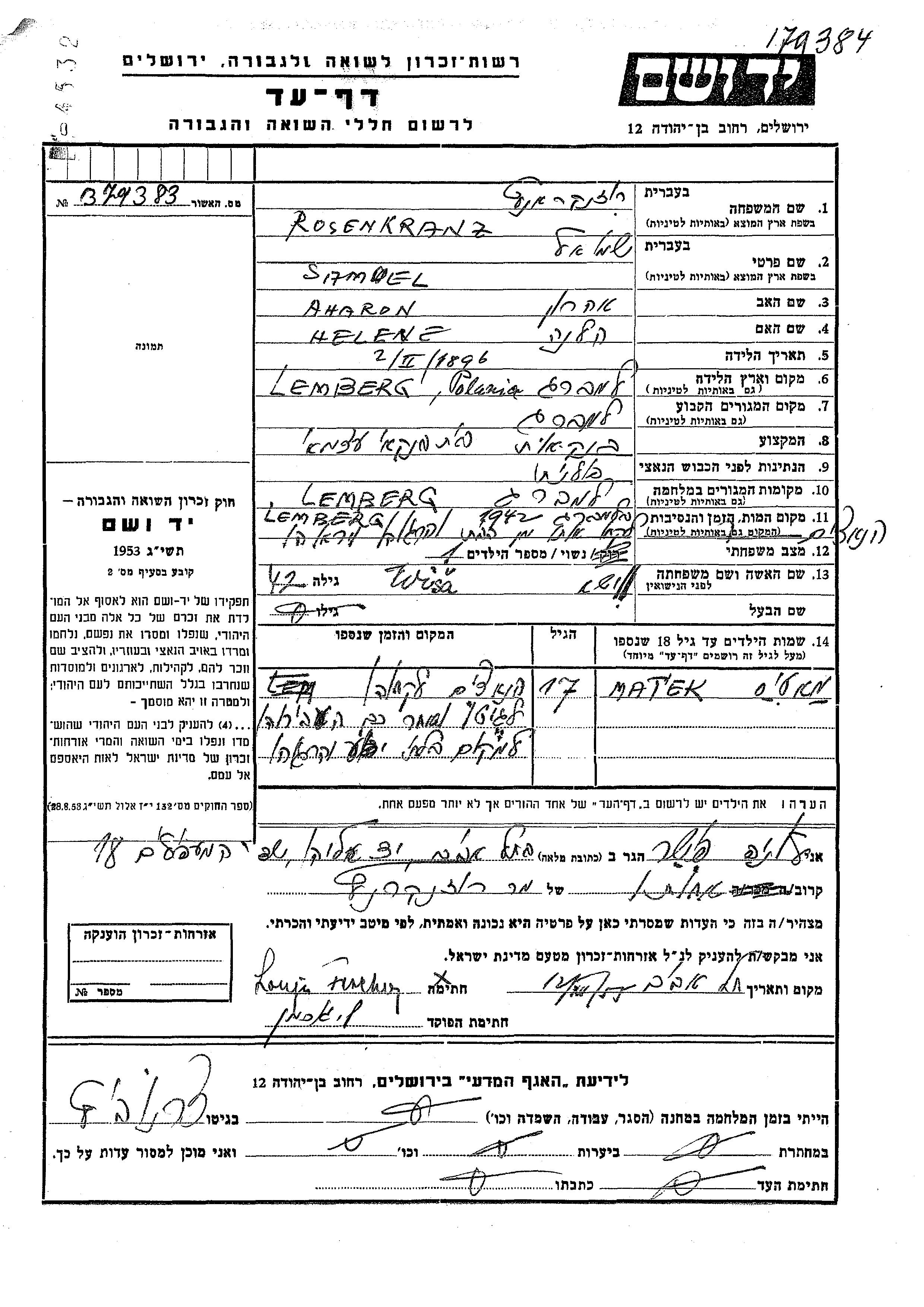 Rozenkranz Shmuel 1896 Lemberg, Pologne Feuille de témoignage