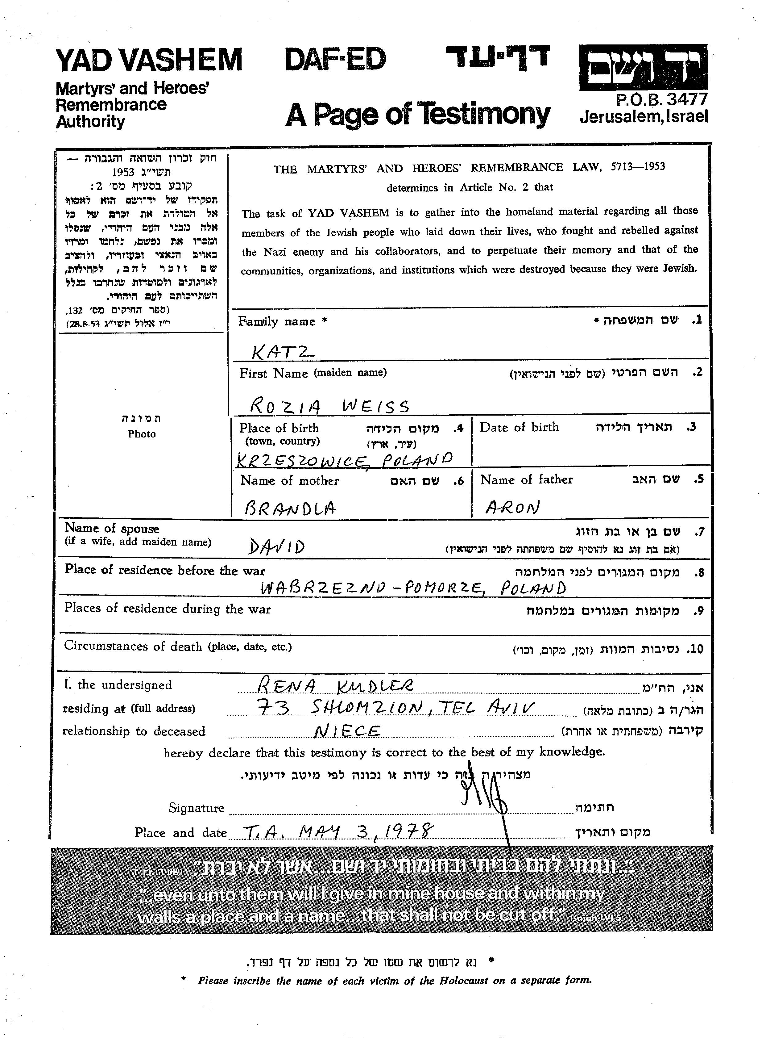 Katz | Rozia | Wabrzezno, Pologne | Feuille de témoignage | |