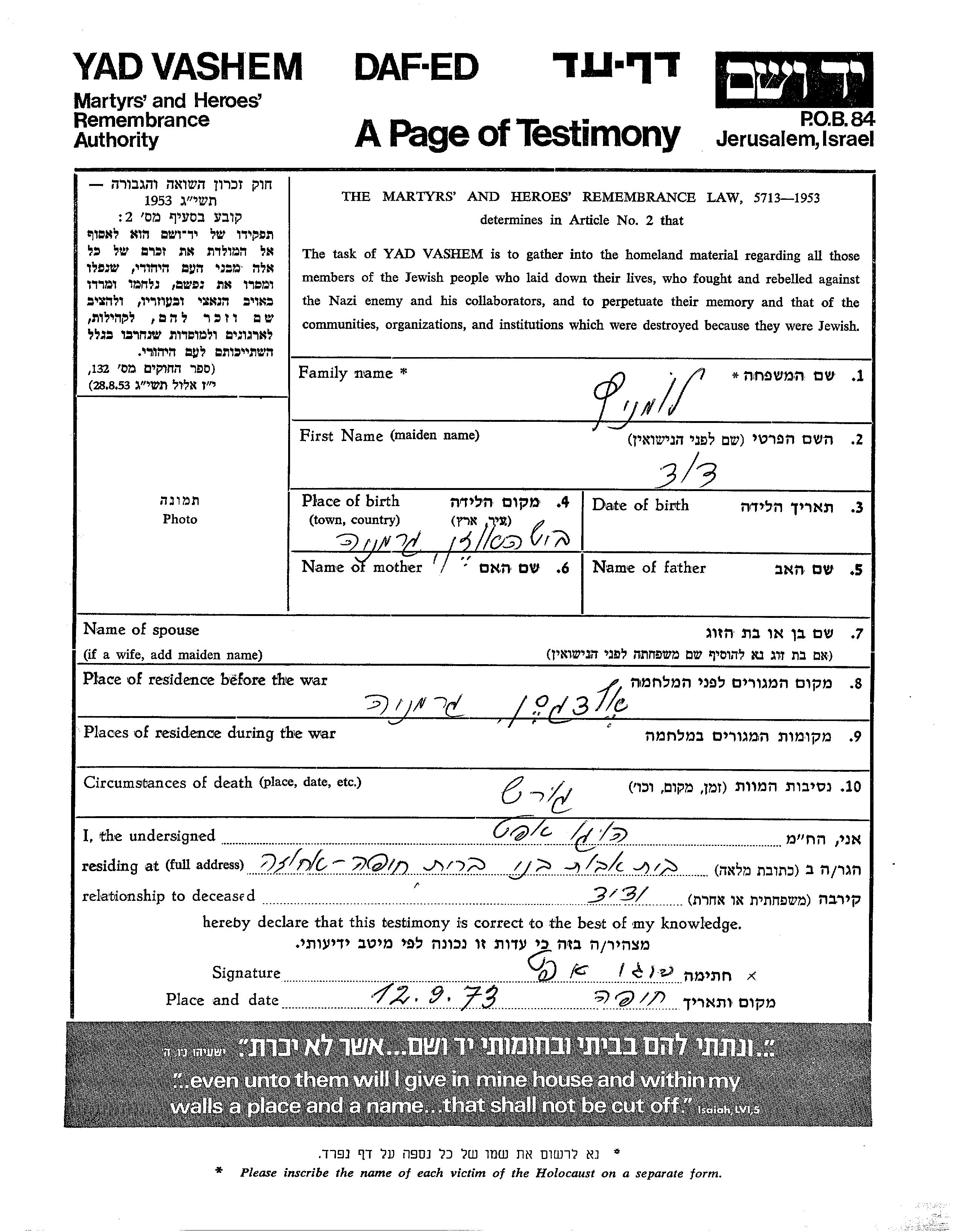 Yad Vashem - Pages of Testimony Names Memorial Collection