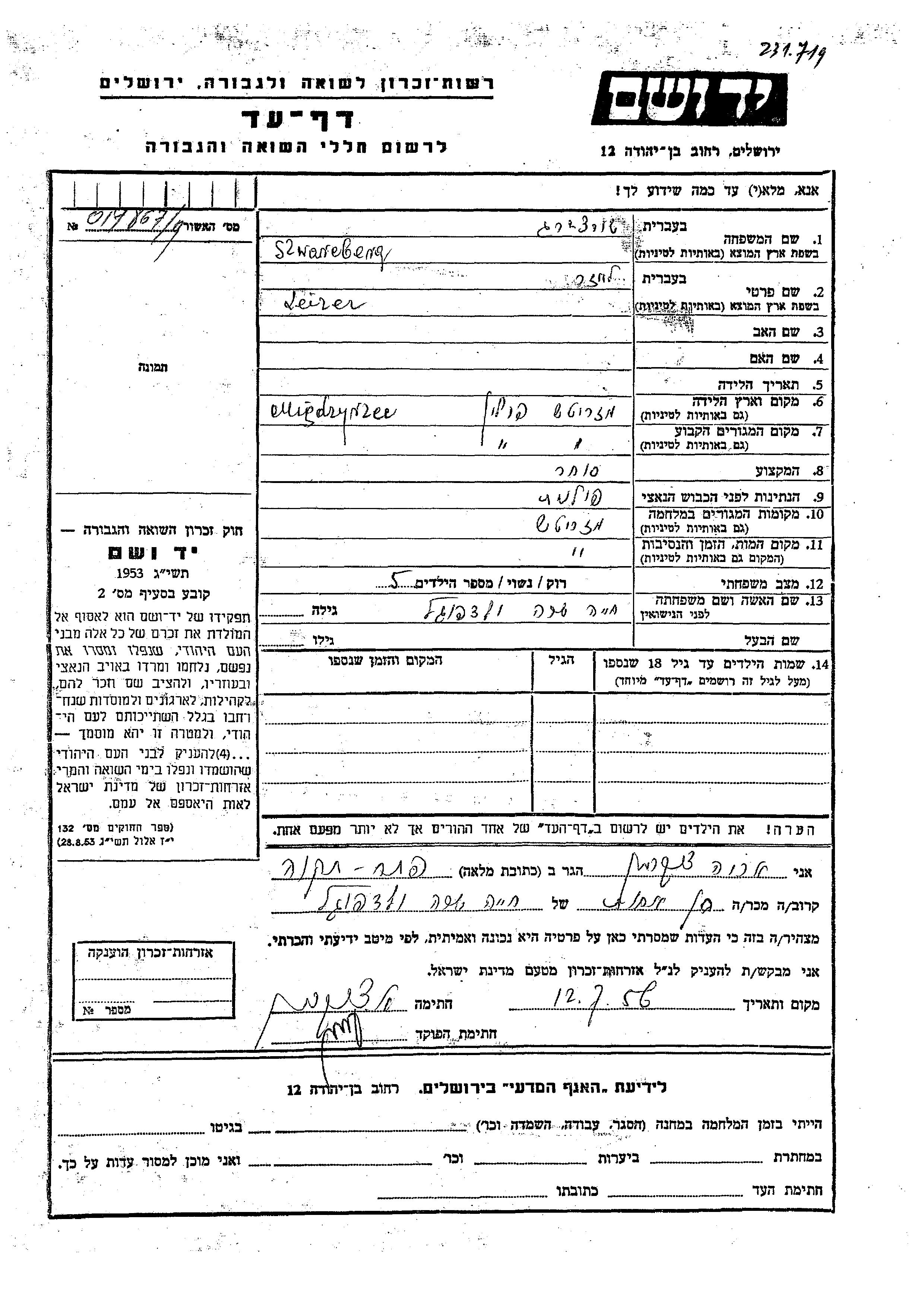 Leizer a été assassiné pendant la Shoah. Lieu de la mort: Miedzyrzec, Pologne.