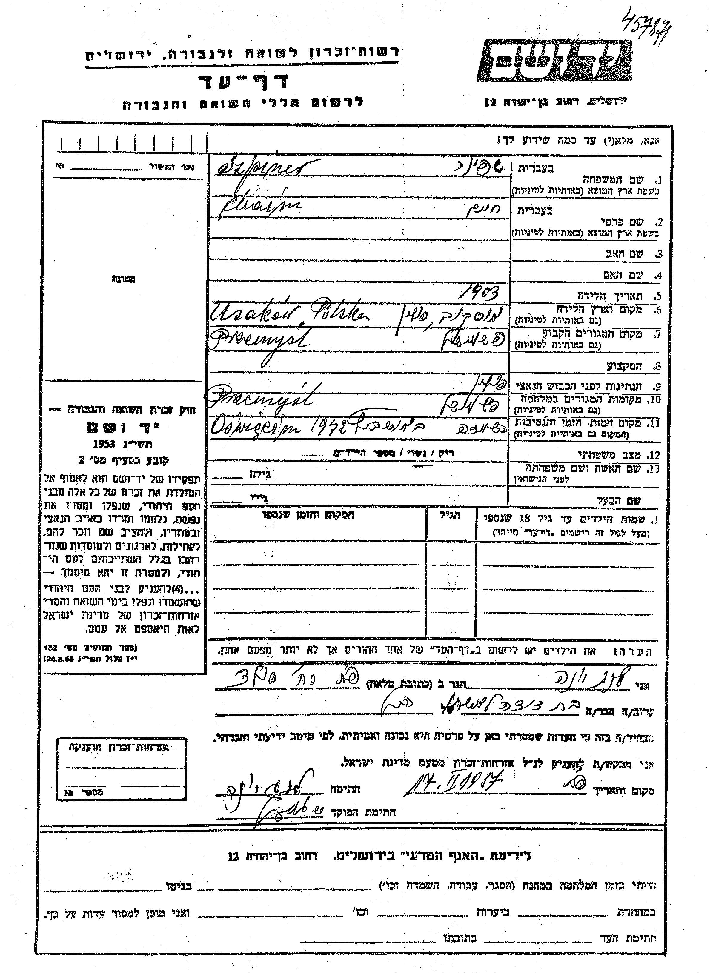 Szpiner Chaim 1903 Przemysl, Pologne Feuille de témoignage
