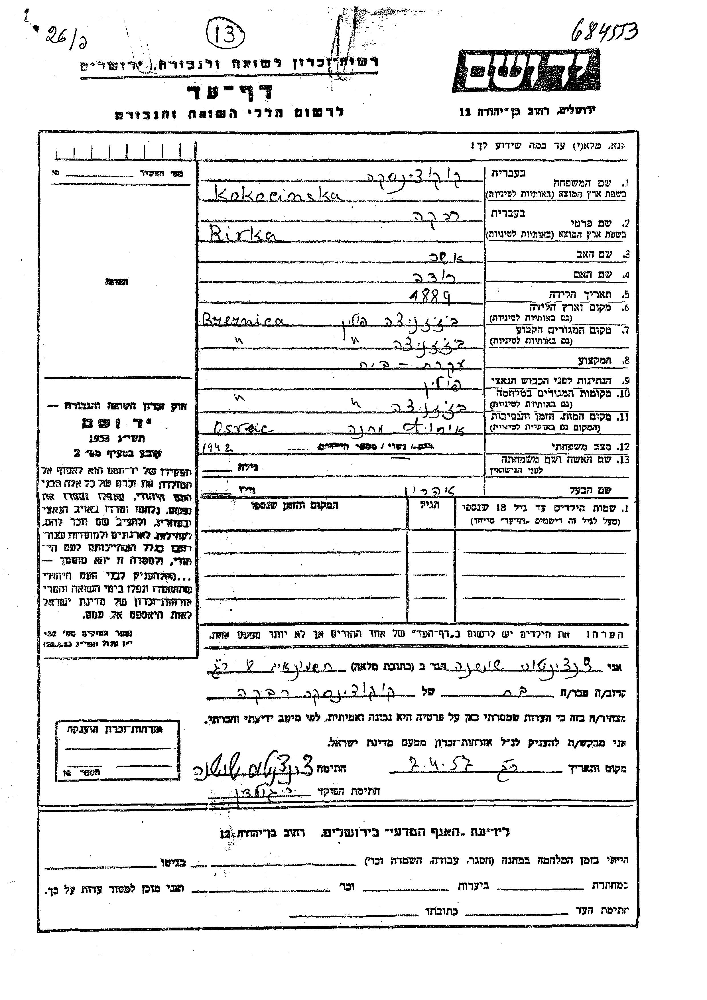 Rivka Kokocinska est née à Brzeznica, Pologne en 1889, fille de Asher et de Roda. Elle était Femme au foyer et Mariée à Aharon. Avant la seconde guerre mondiale elle vivait à Brzeznica, Pologne. Pendant la guerre, elle était à Brzeznica, Pologne.