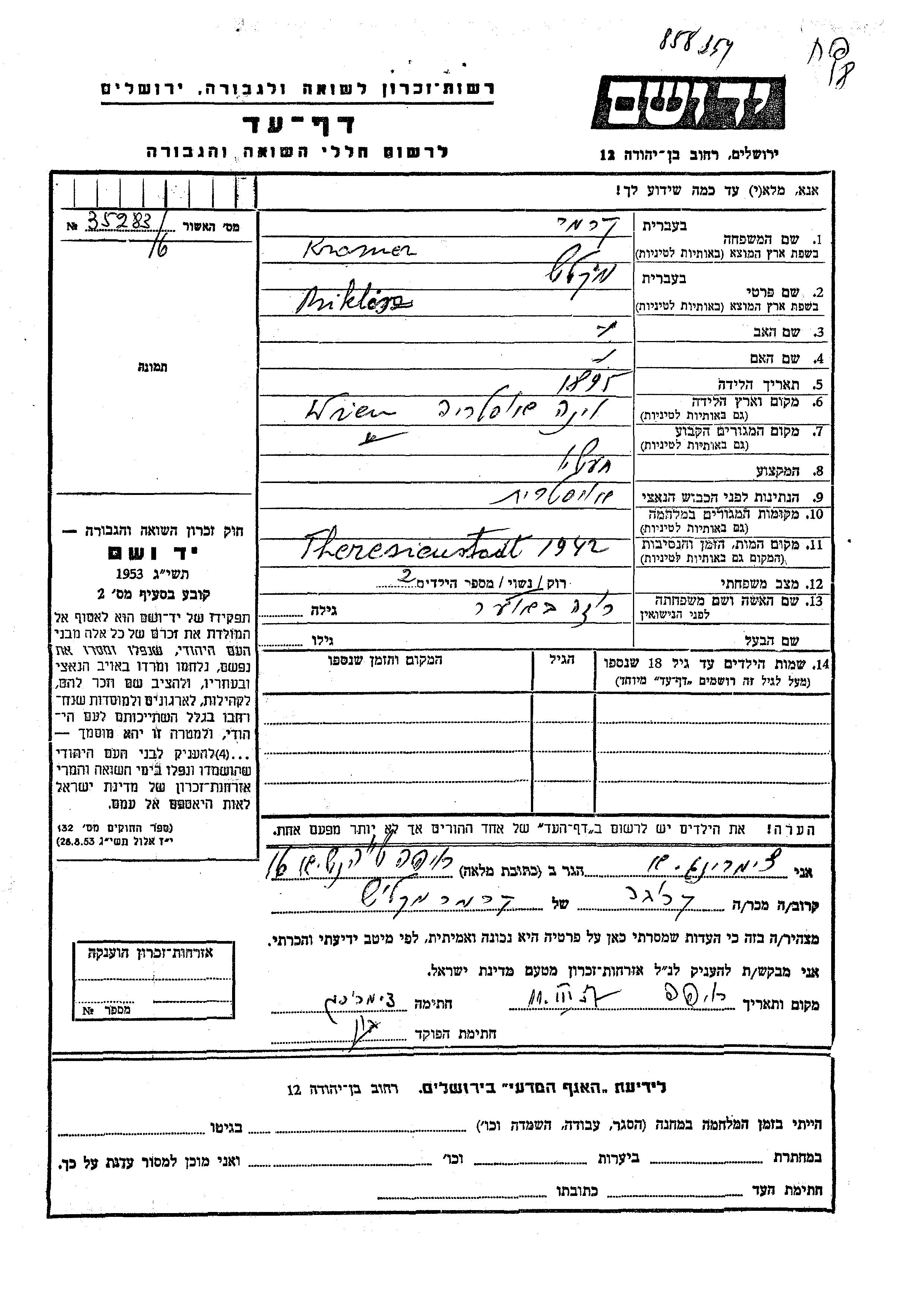 Kramer Miklosz 1895 Wien, Autriche Feuille de témoignage