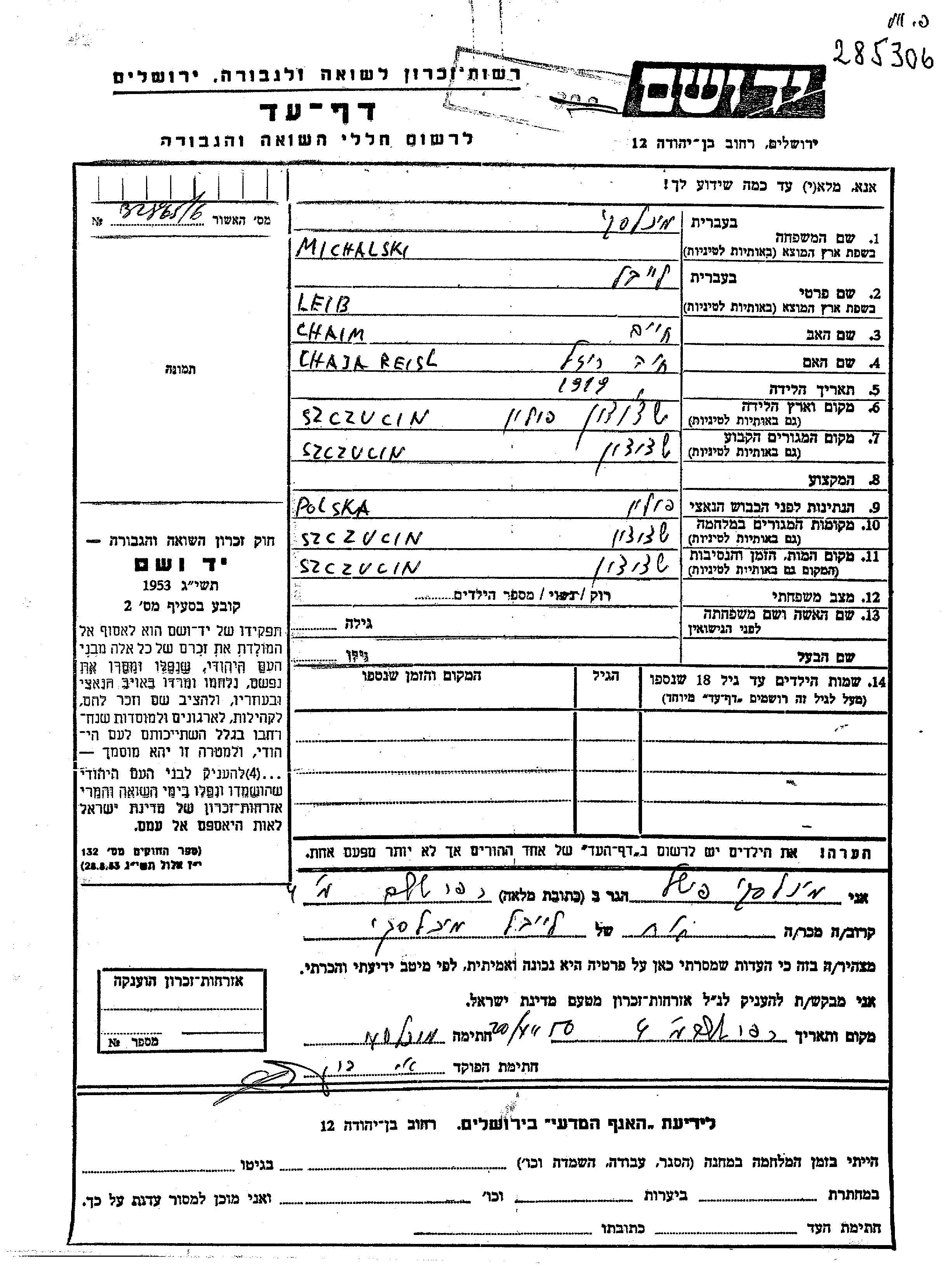 Michalski Leibel 1919 Szczucin, Pologne Feuille de témoignage