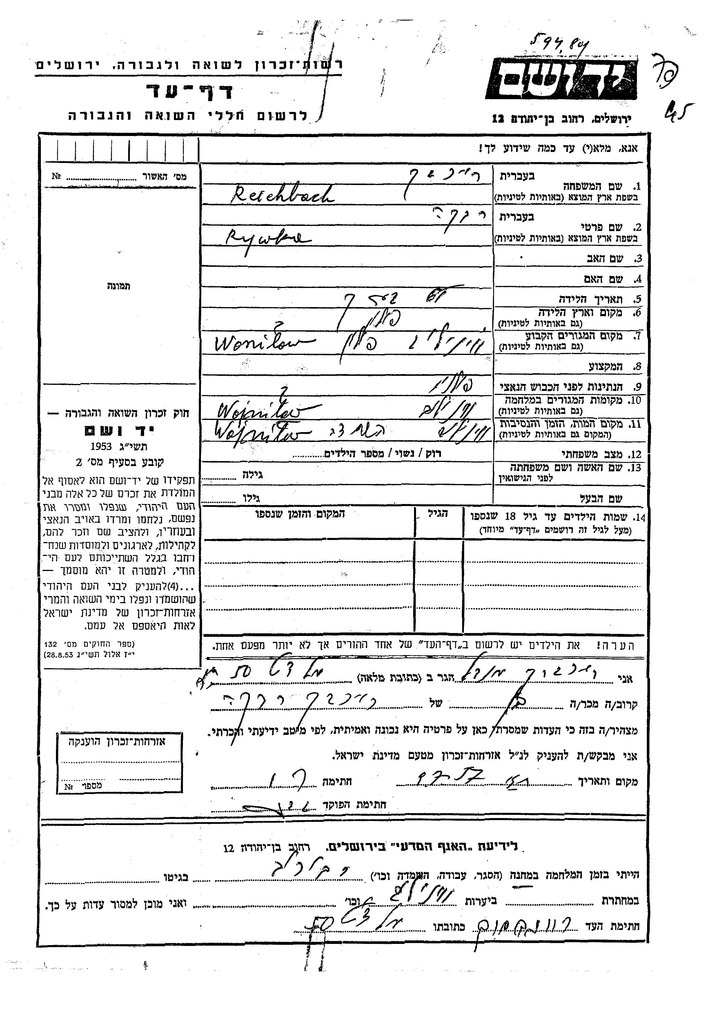 Reichbach Rywka Woinelow, Pologne Feuille de témoignage