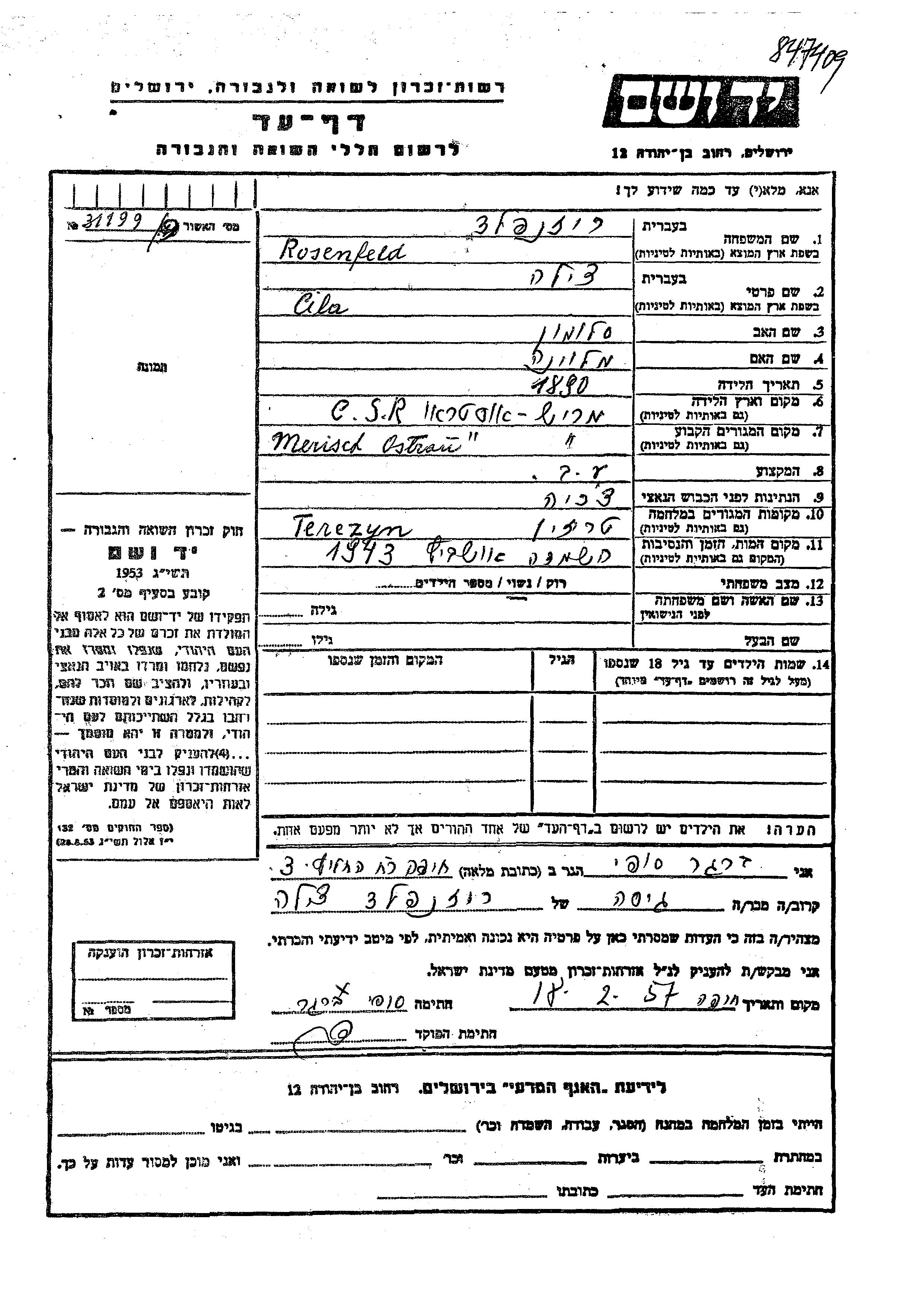 Rosenfeld Cila 1890 Maehrisch Ostrau, Tchécoslovaquie Feuille de témoignage