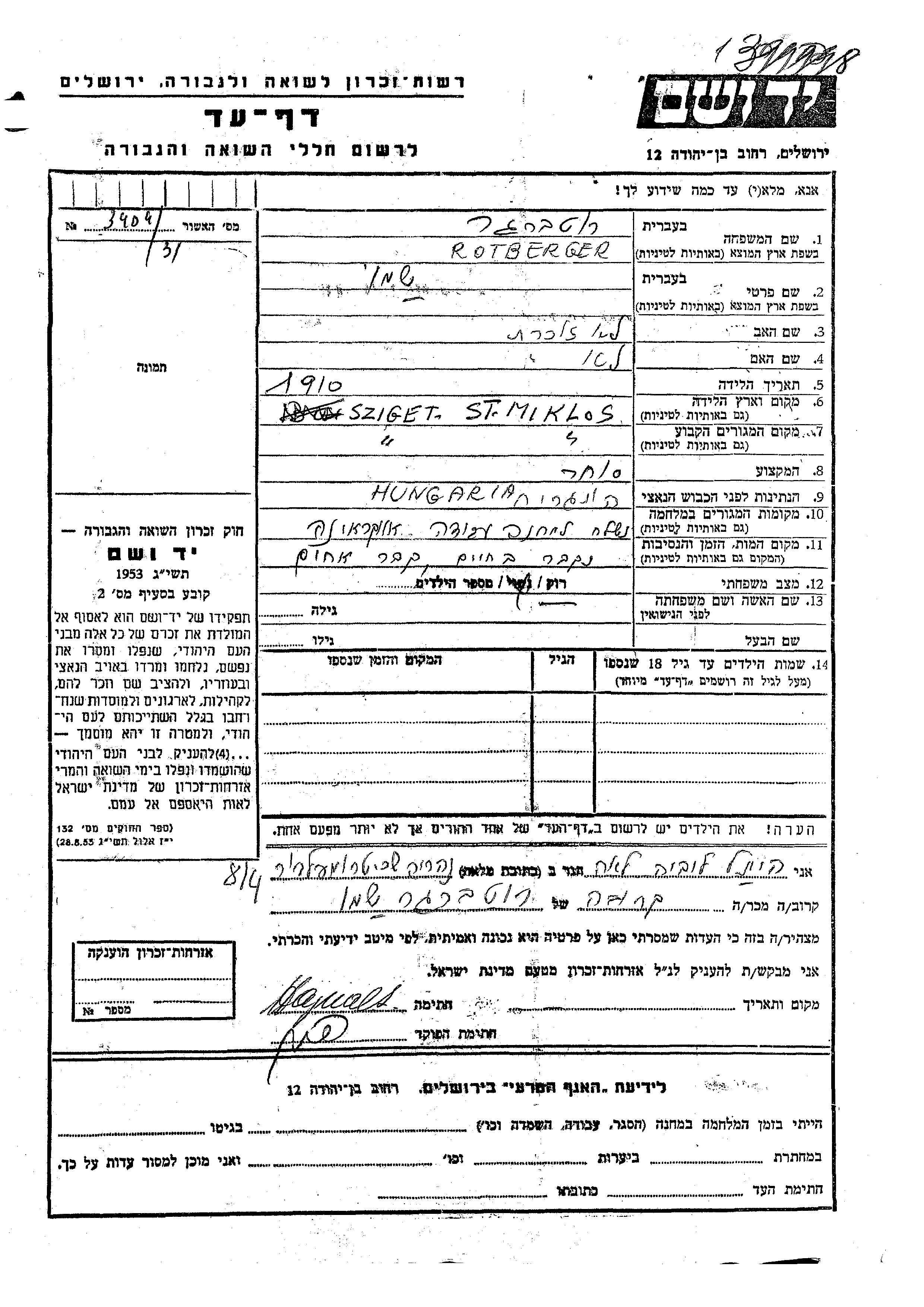 Shamu Rotberger est né à Sziget en 1910. Il était Commerçant/e et Célibataire. Avant la seconde guerre mondiale il vivait à Sziget. Au cours de la guerre, il était à Ukraine (URSS).