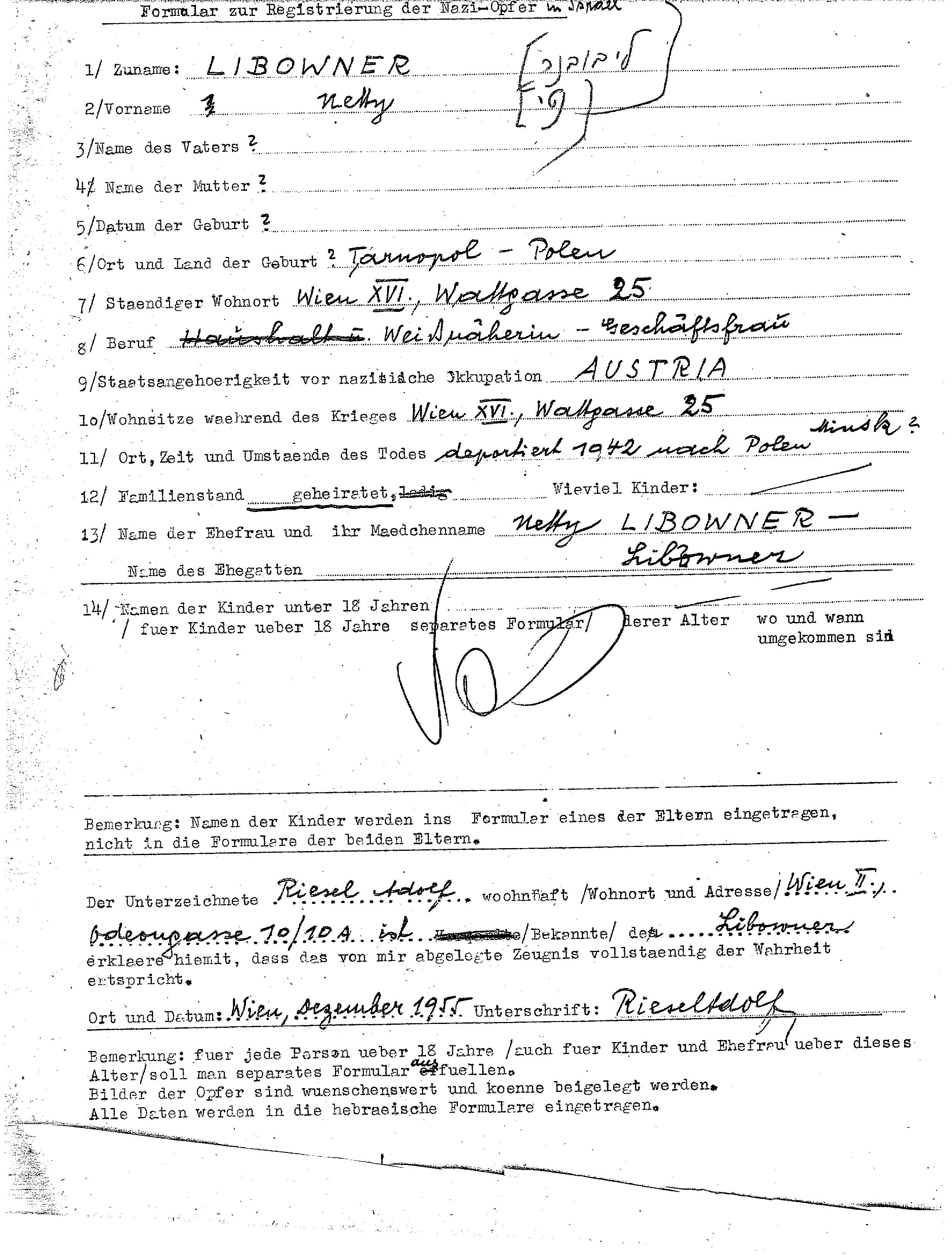 Netty Neti Libowner est née à Tarnopol, Pologne. Elle était Couturière et Célibataire. Avant la seconde guerre mondiale elle vivait à Wien, Autriche. Pendant la guerre, elle était à Wien, Autriche.
