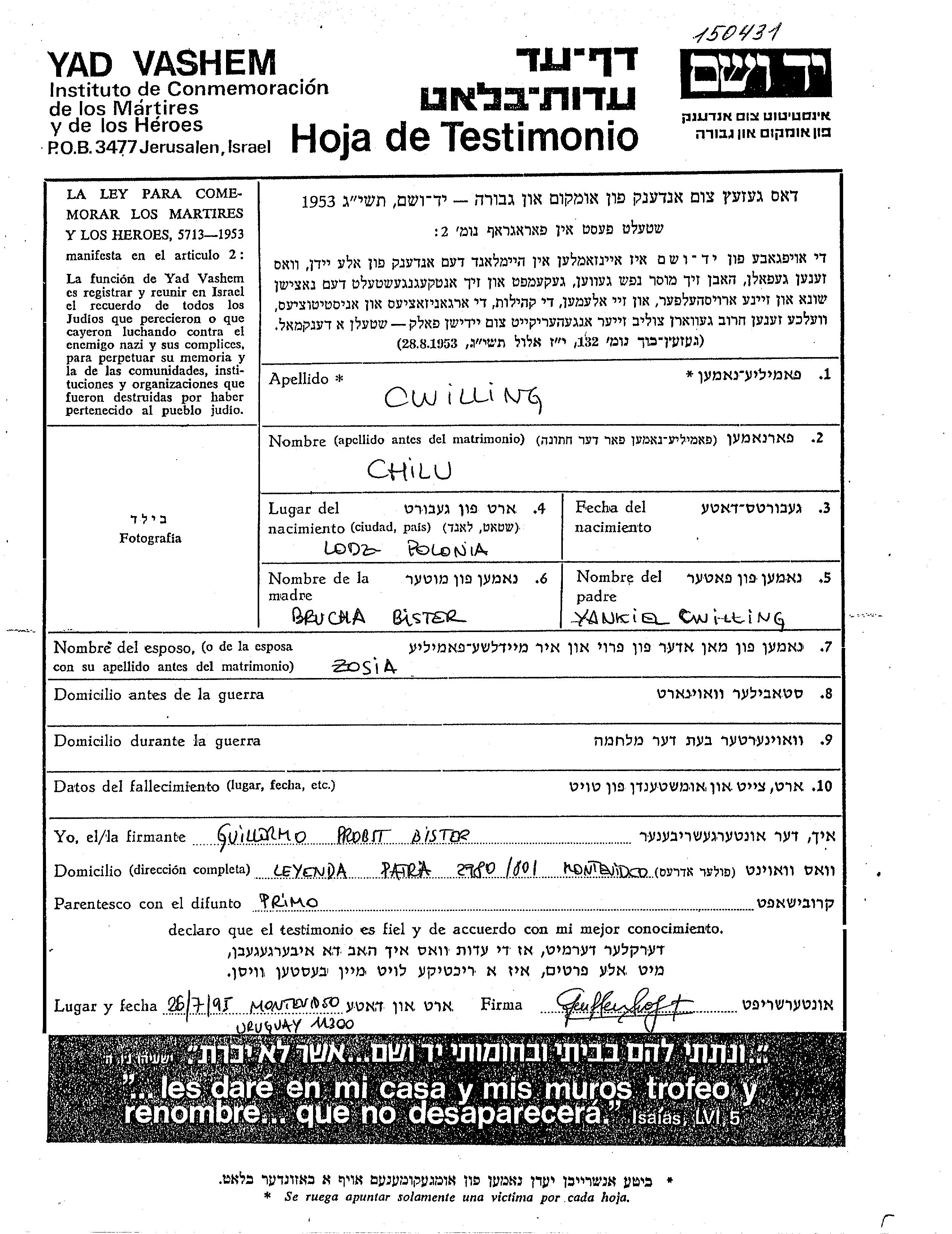 Cwilling Chilu endroit inconnu, Feuille de témoignage