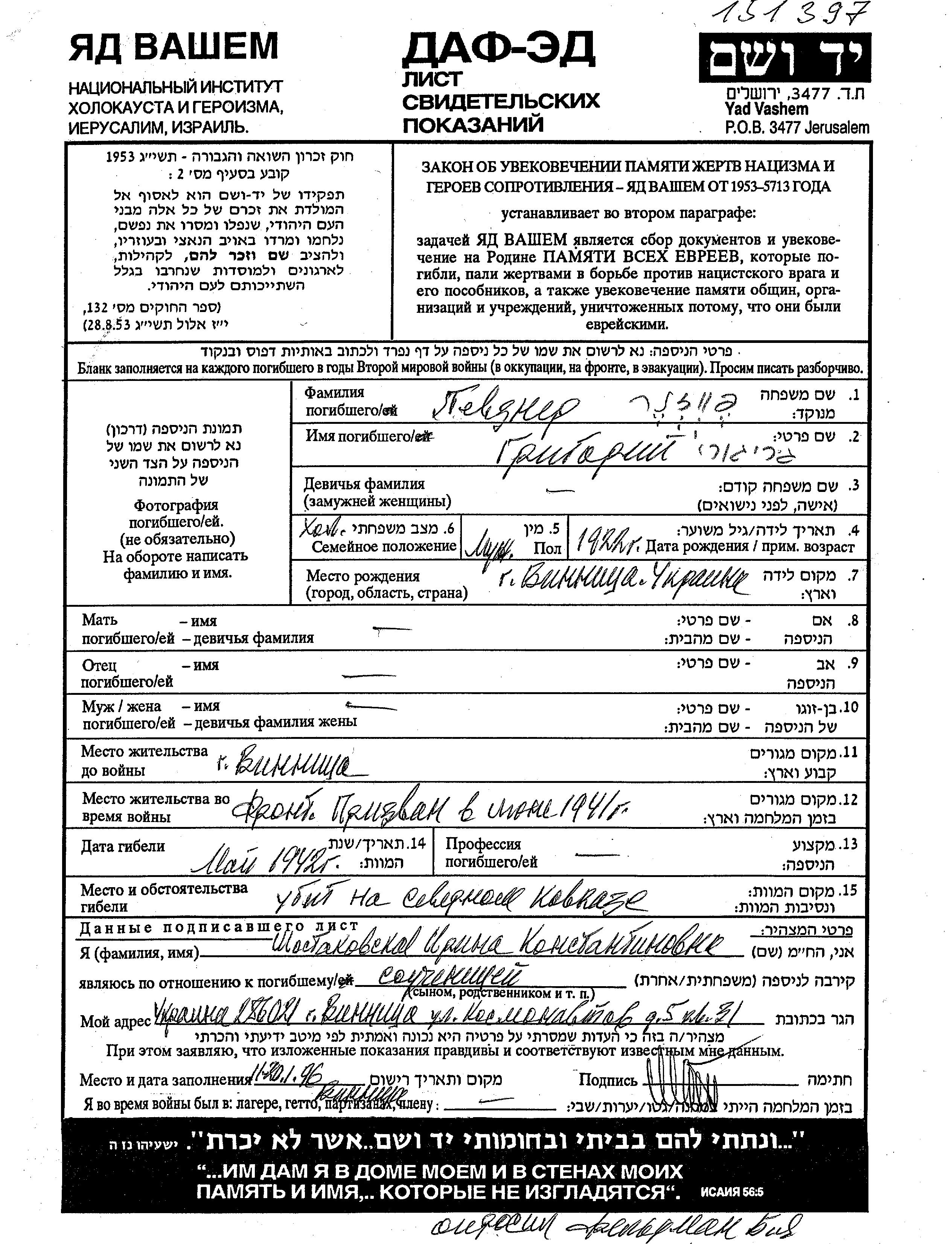 Pevzner Grigori 1922 Vinnitsa, Ukraine (URSS) Feuille de témoignage