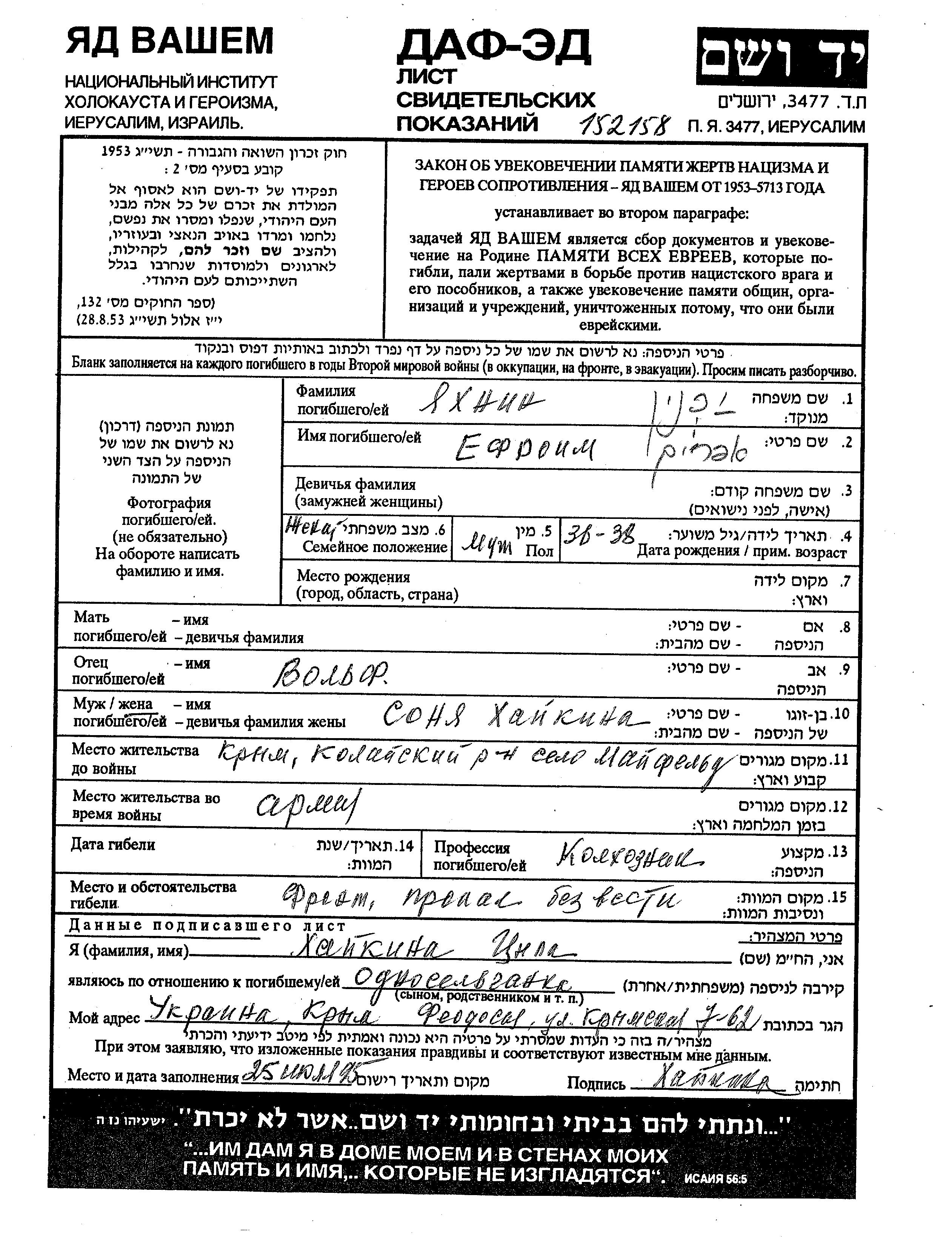 Efroim Yakhnin est né fils de Volf. Il était Agriculteur et Mariée à Sonia. Avant la seconde guerre mondiale il vivait à Mayfeld, Russie (URSS). Au cours de la guerre, il était à the Soviet armed forces.