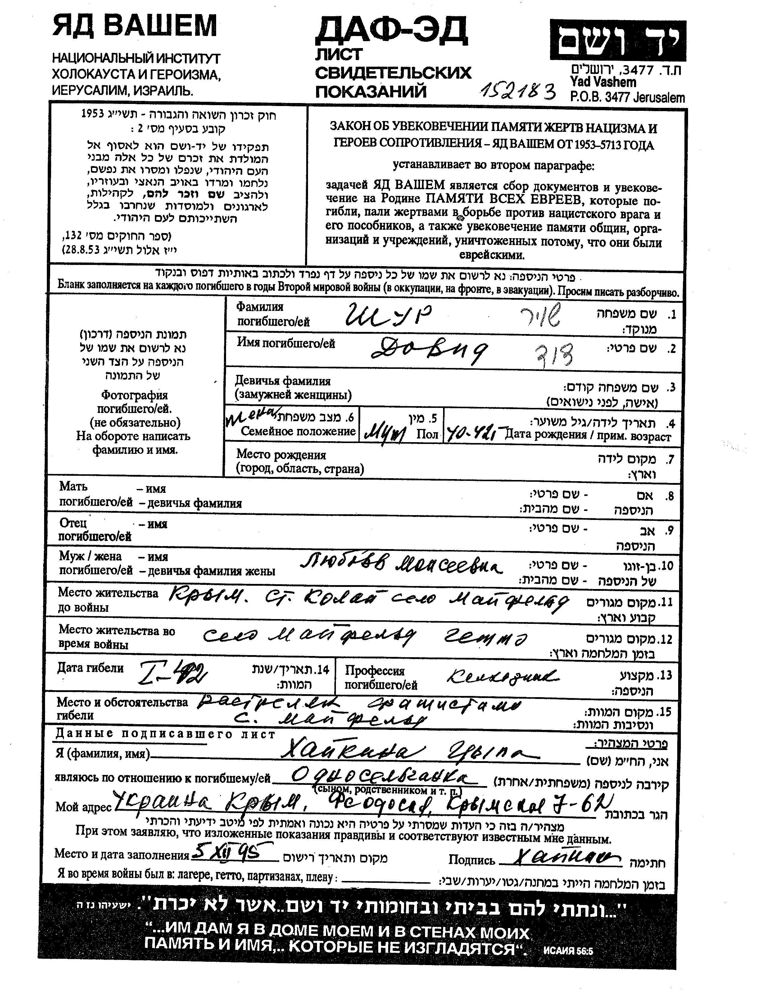 Shur David 1941 Mayfeld, Russie (URSS) Feuille de témoignage