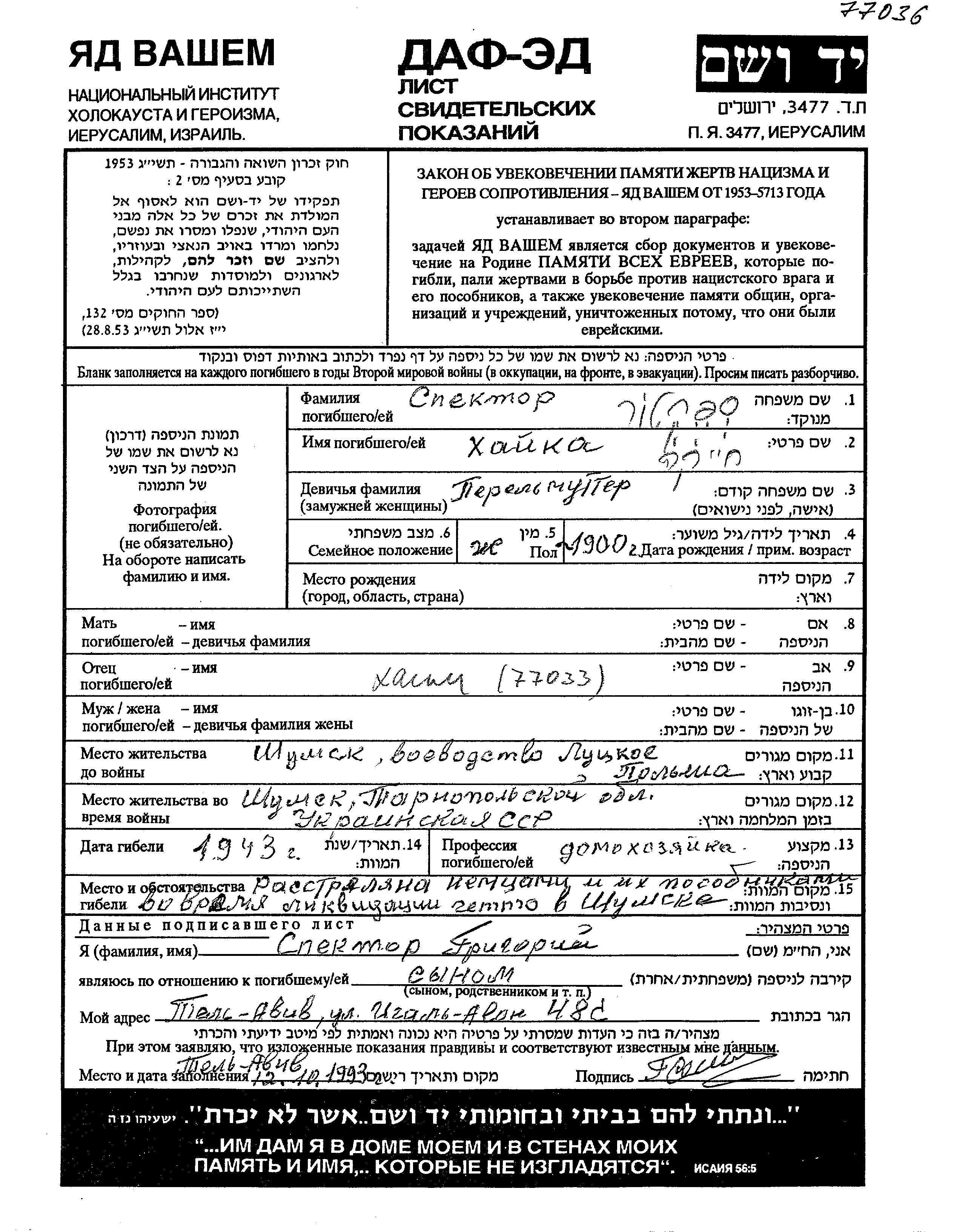 Spektor Khaika 1900 Szumsk, Pologne Feuille de témoignage