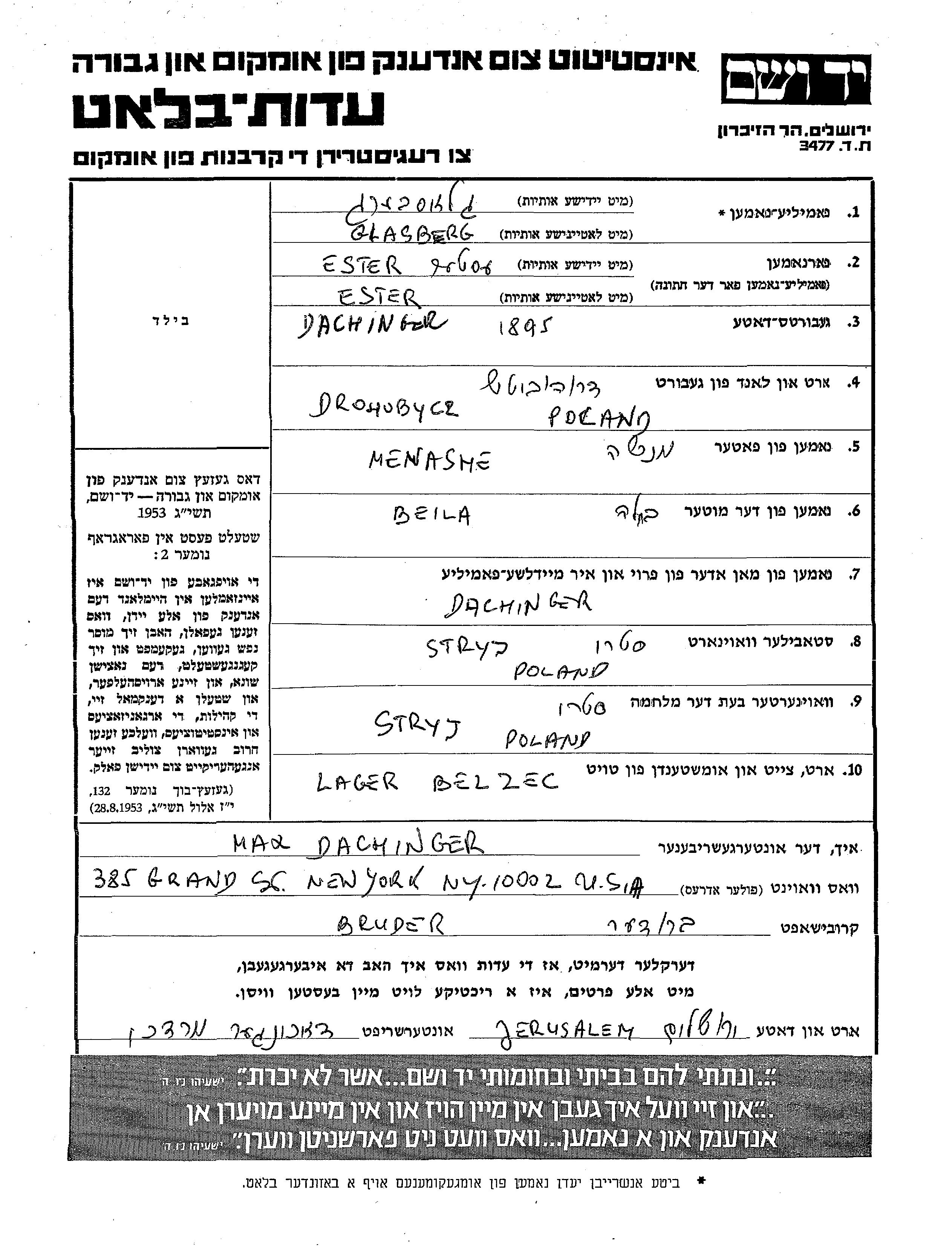 Glasberg Ester 1895 Stryj, Pologne Feuille de témoignage