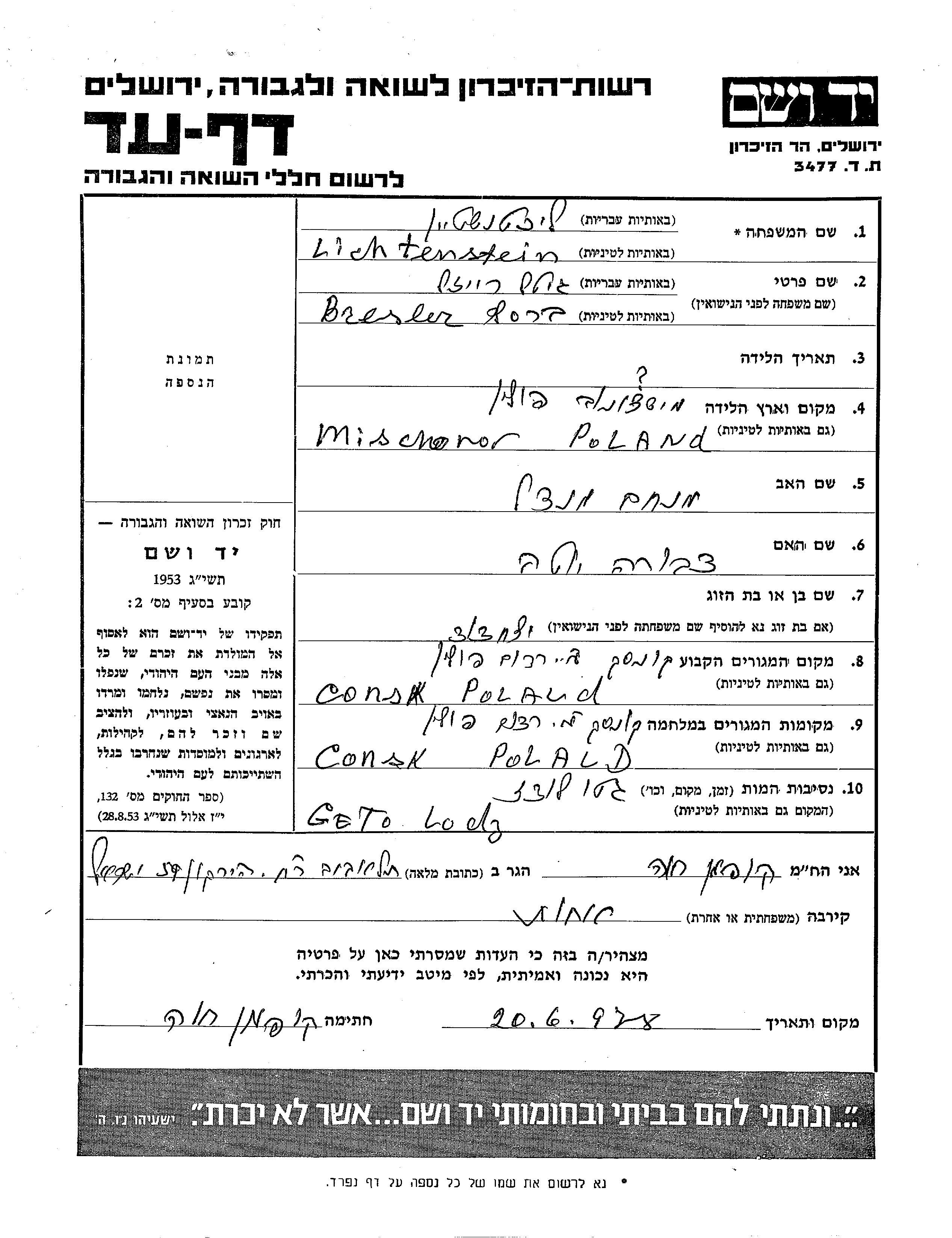 Lichtenstein Gitel Reizl Consk, Pologne Feuille de témoignage