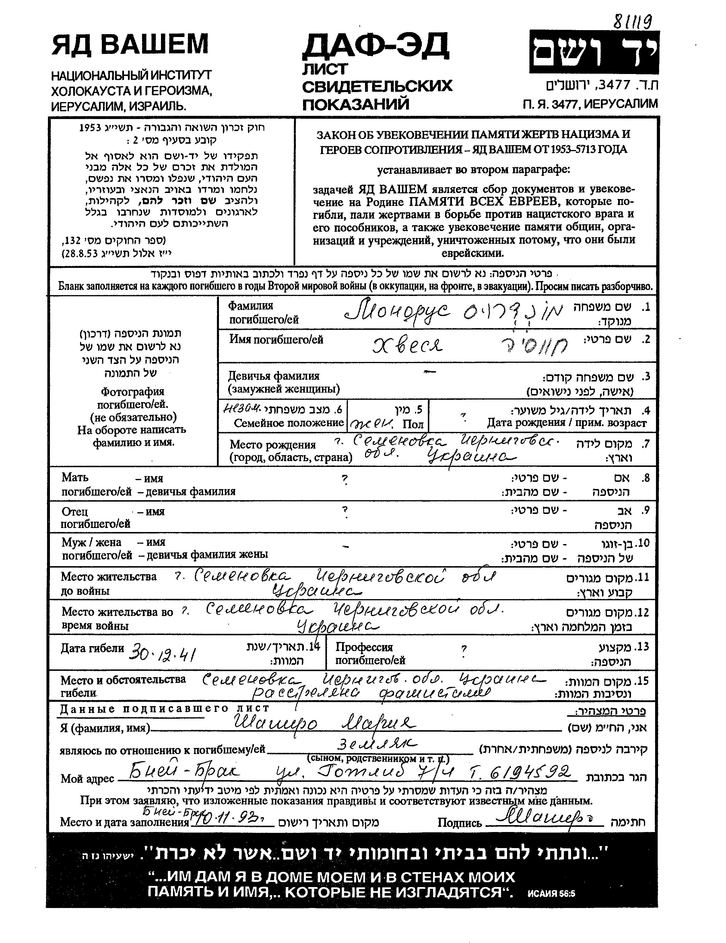 Mondrus Khvesya Semenovka, Ukraine (URSS) Feuille de témoignage
