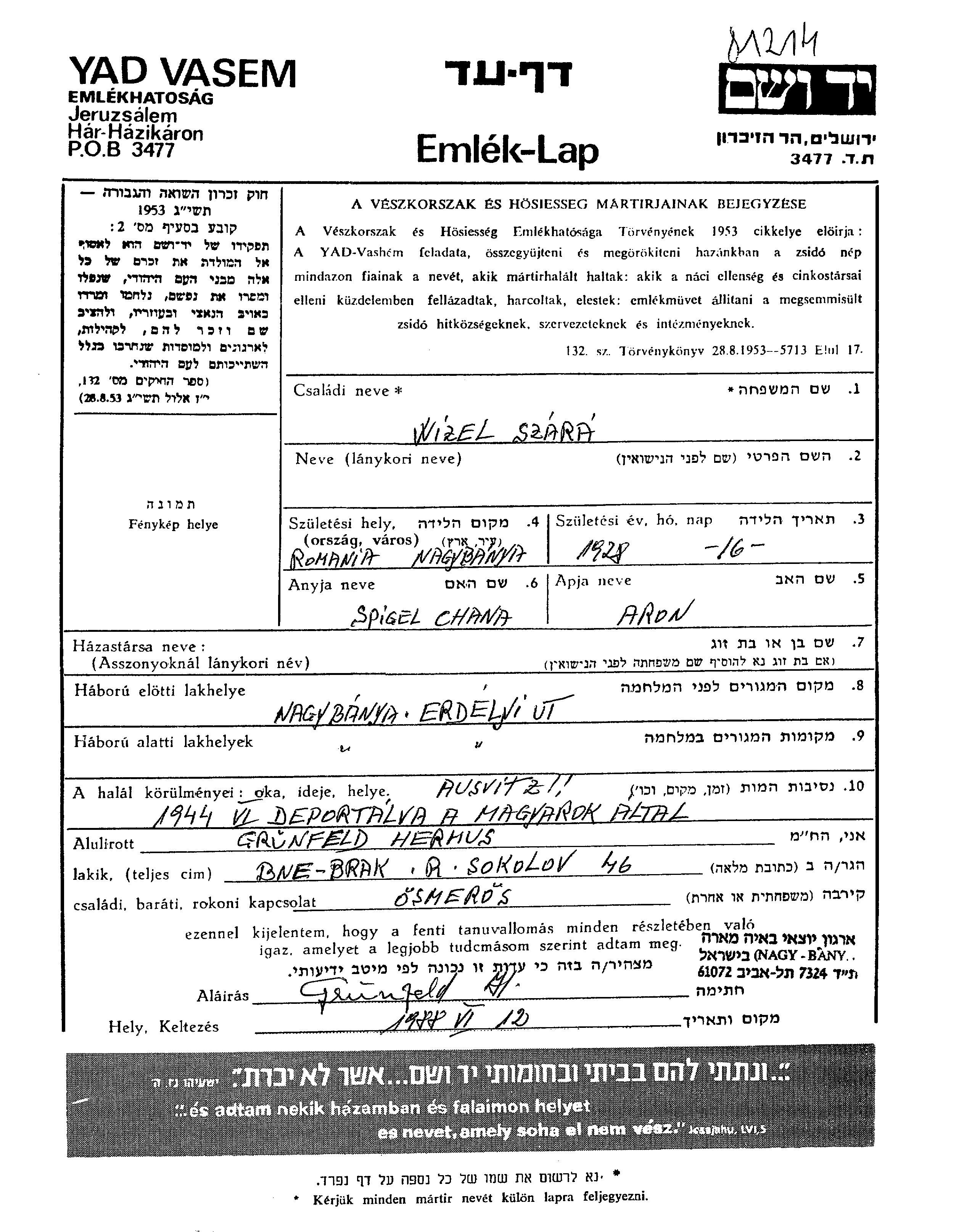 Wiezel Szara 1928 Nagybánya, Roumanie Feuille de témoignage