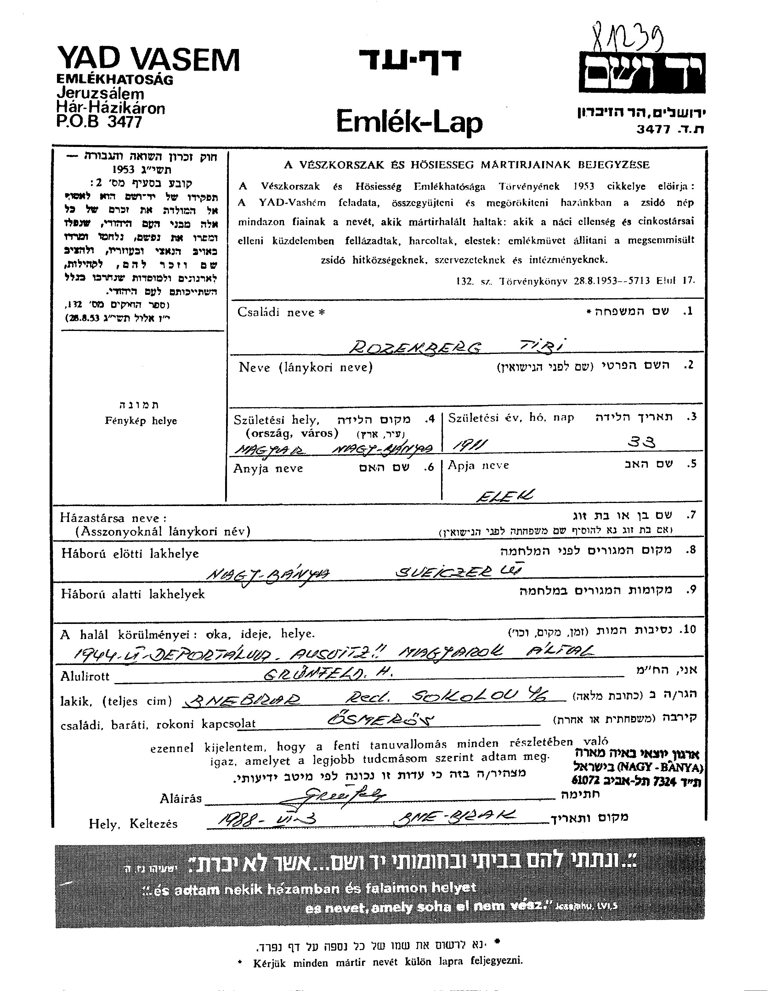 Rosenberg Tibi 1911 Nagybánya, Roumanie Feuille de témoignage