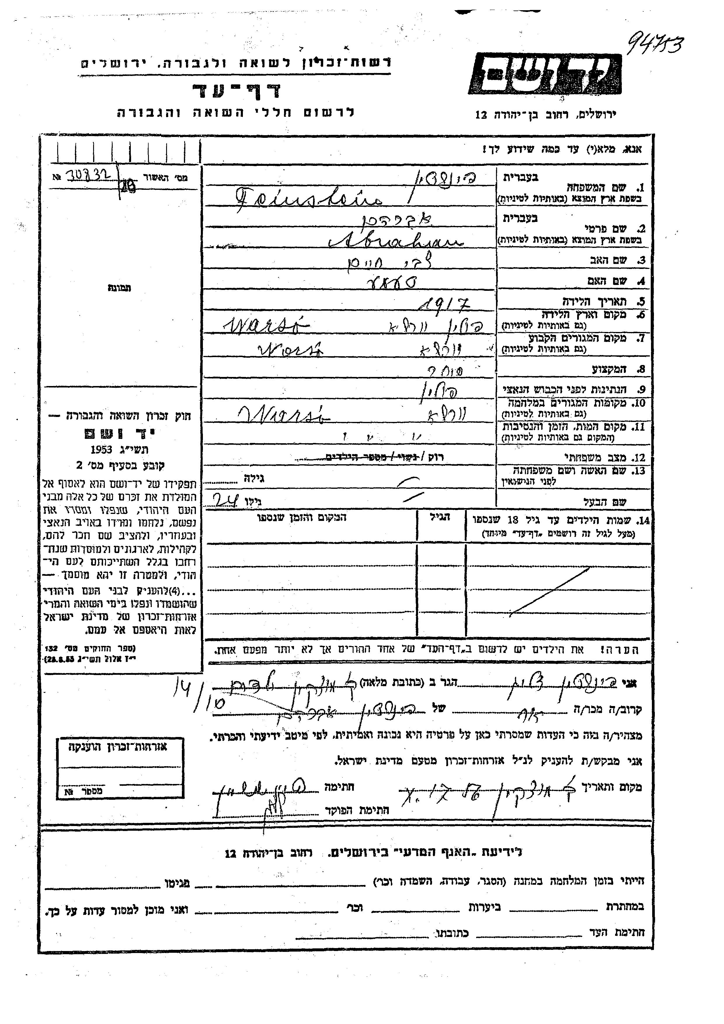Feinstein Abraham 1917 Warszawa, Pologne Feuille de témoignage