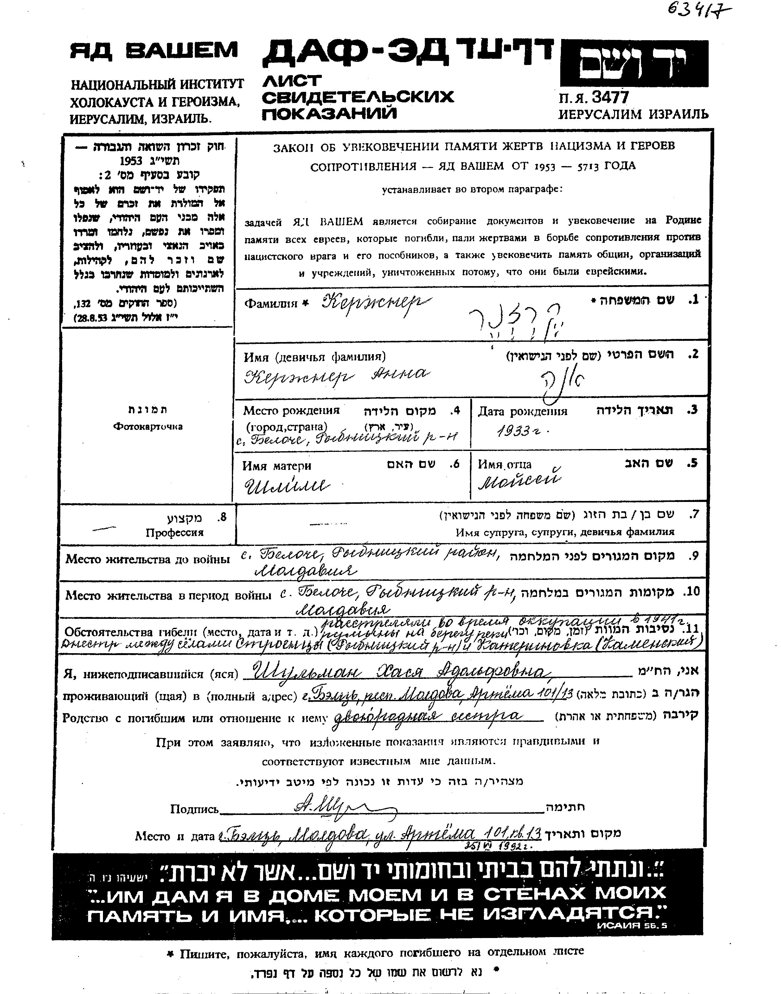 Kerzhner Anna 1933 Bilavati, Roumanie Feuille de témoignage
