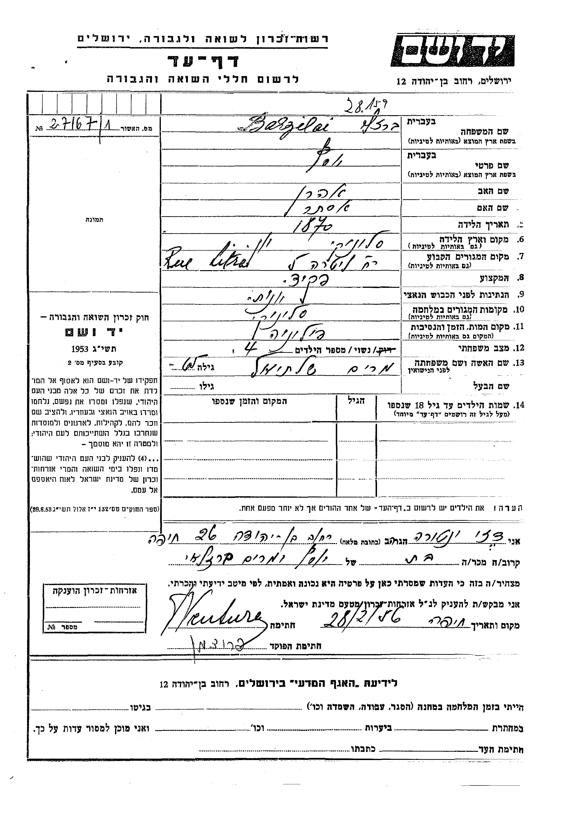 Yosef Barzelai est né à Saloniki, Grèce en 1870, fils de Aharon et de Ester. Il était Employé/e de bureau et Mariée à Miriam née Shaltiel. Au cours de la guerre, il était à Saloniki, Grèce.
