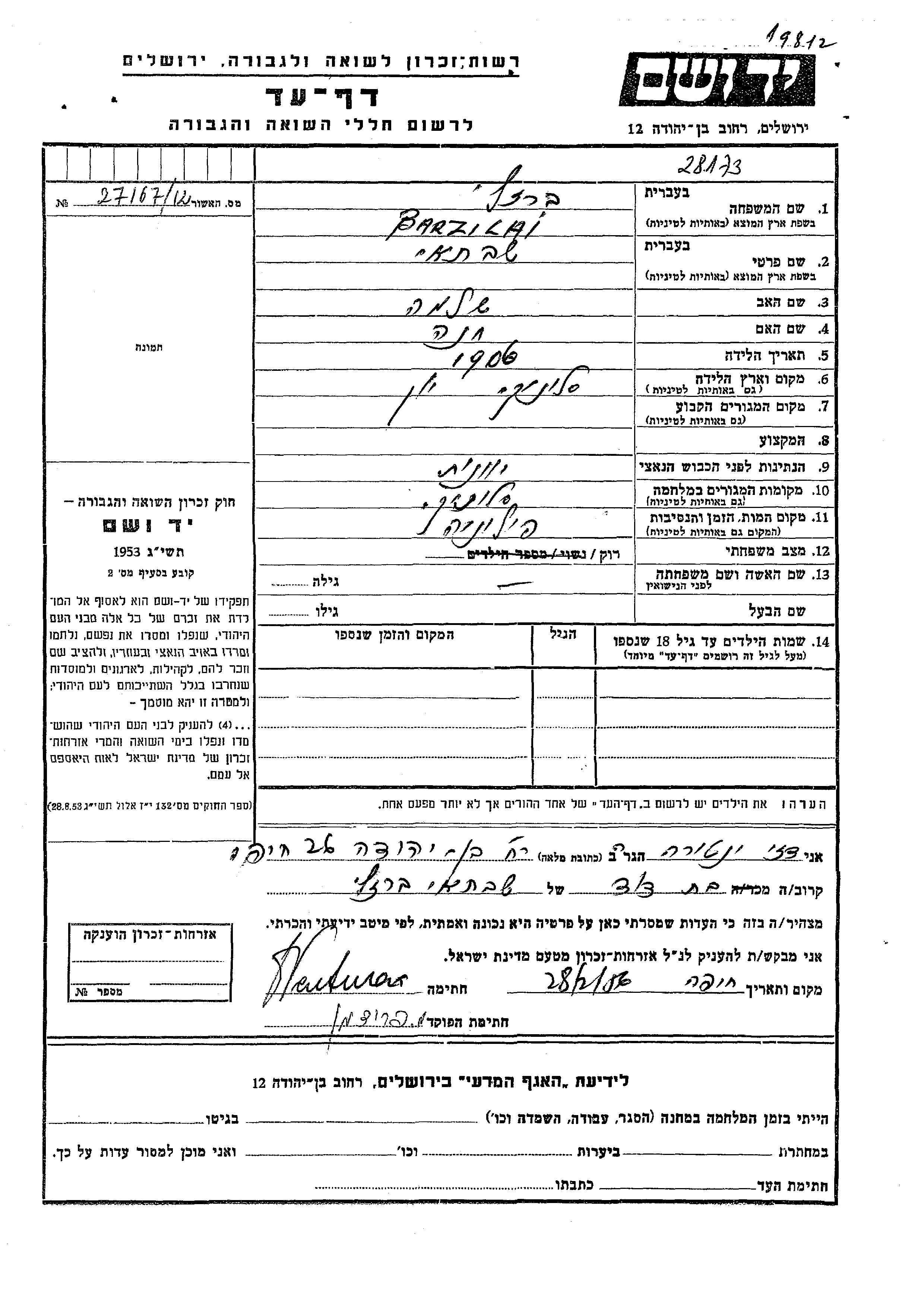 Barzilai Shabtai 1906 Salonika, Grèce Feuille de témoignage