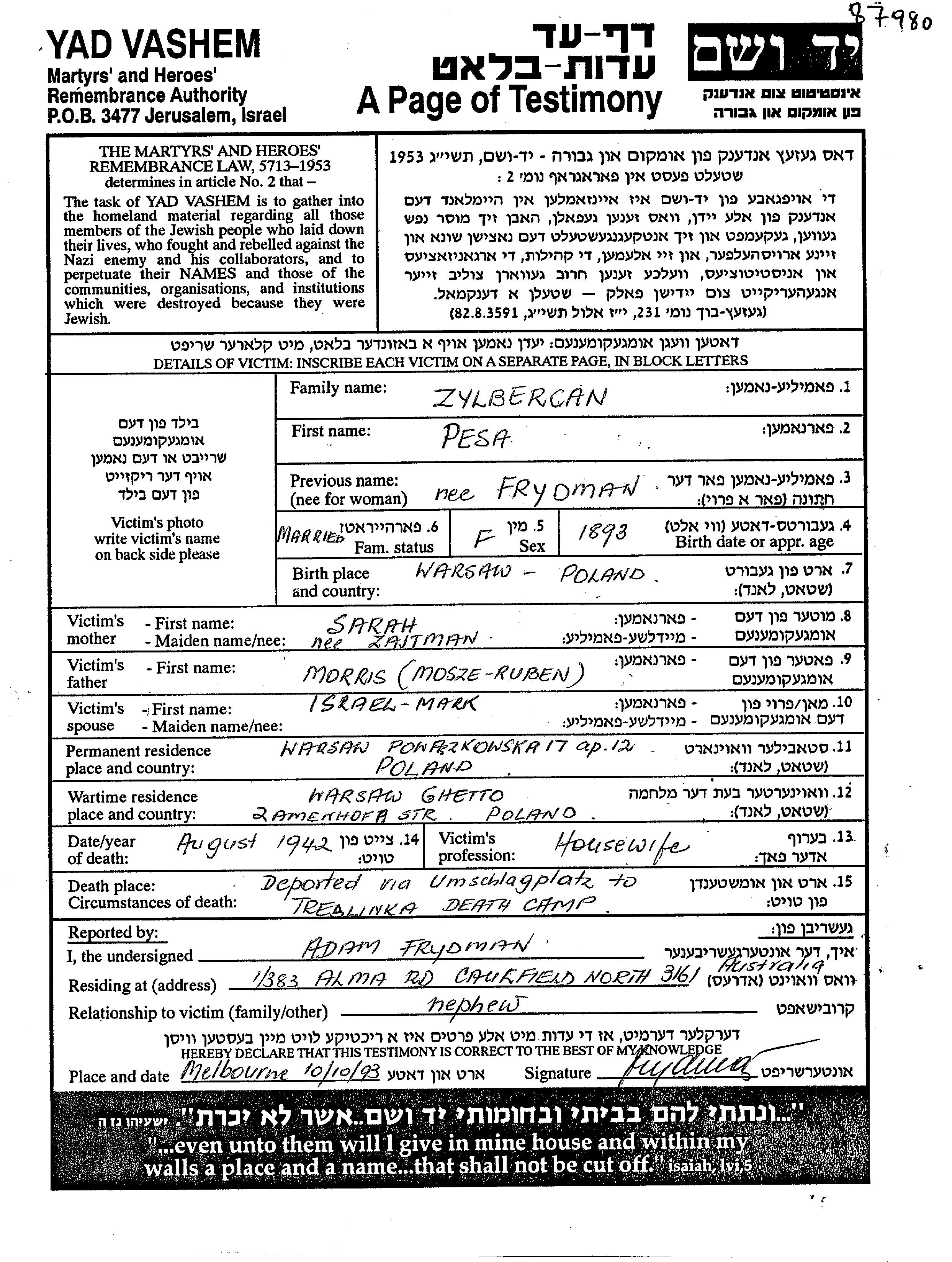 Pesa Zylbercan née Frydman est née à Warszawa, Pologne en 1893, fille de Morris Mosze Reuven et de Sara née Zajtman. Elle était Femme au foyer et Mariée à Israel Mark. Avant la seconde guerre mondiale elle vivait à Warszawa, Pologne. Pendant la guerre, elle était à Warszawa, Pologne.