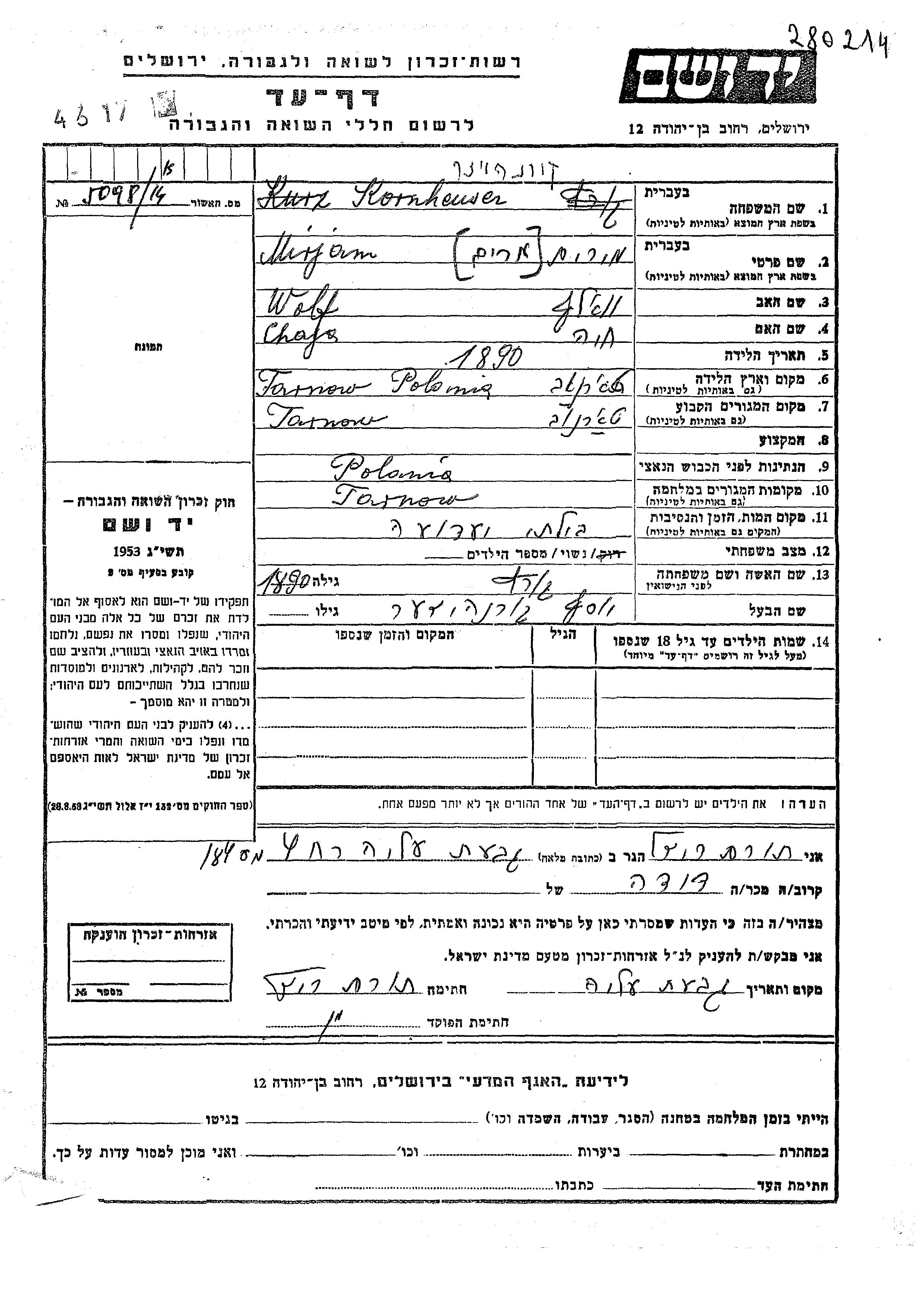 Kornhauser Mirjam 1890 Tarnow, Pologne Feuille de témoignage