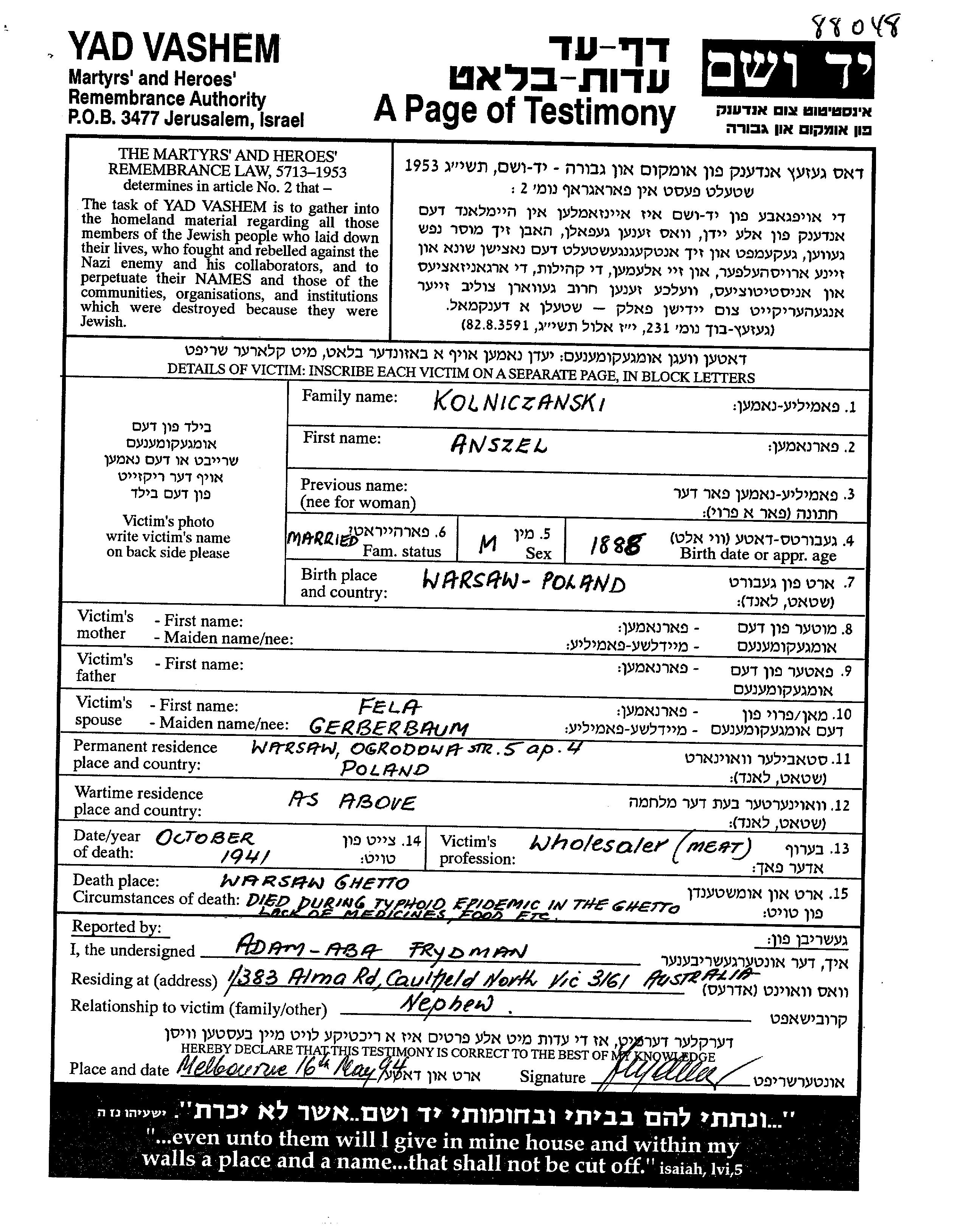 Anszel Kolniczanski est né à Warszawa, Pologne en 1888. Il était Abatteur rituel et Mariée à Fela. Avant la seconde guerre mondiale il vivait à Warszawa, Pologne. Au cours de la guerre, il était à Warszawa, Pologne.