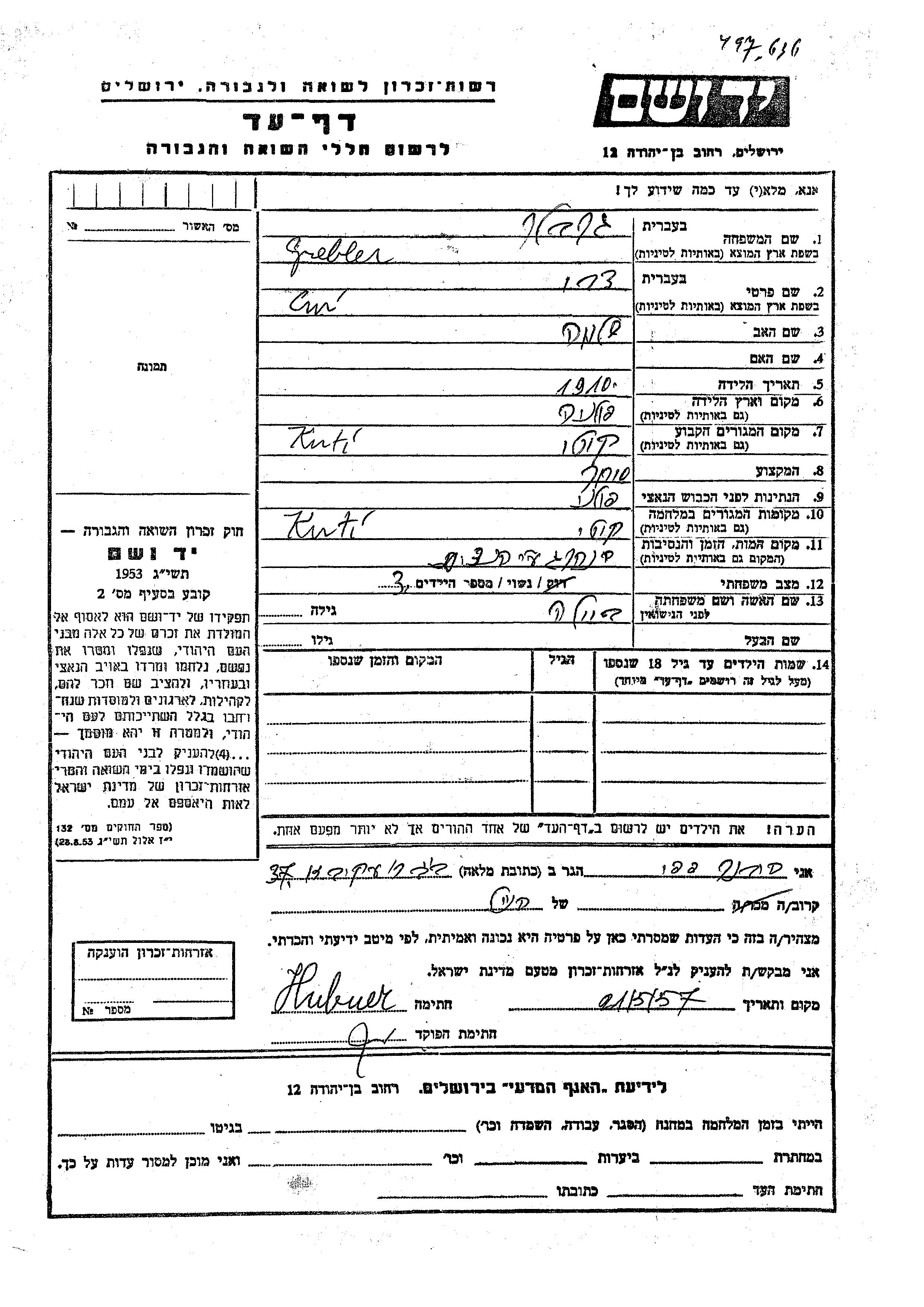 Cvi Grebler est né à Pologne en 1910, fils de Shlomo. Il était Commerçant/e et Mariée à Beila. Avant la seconde guerre mondiale il vivait à Kuti, Pologne. Au cours de la guerre, il était à Kuti, Pologne.