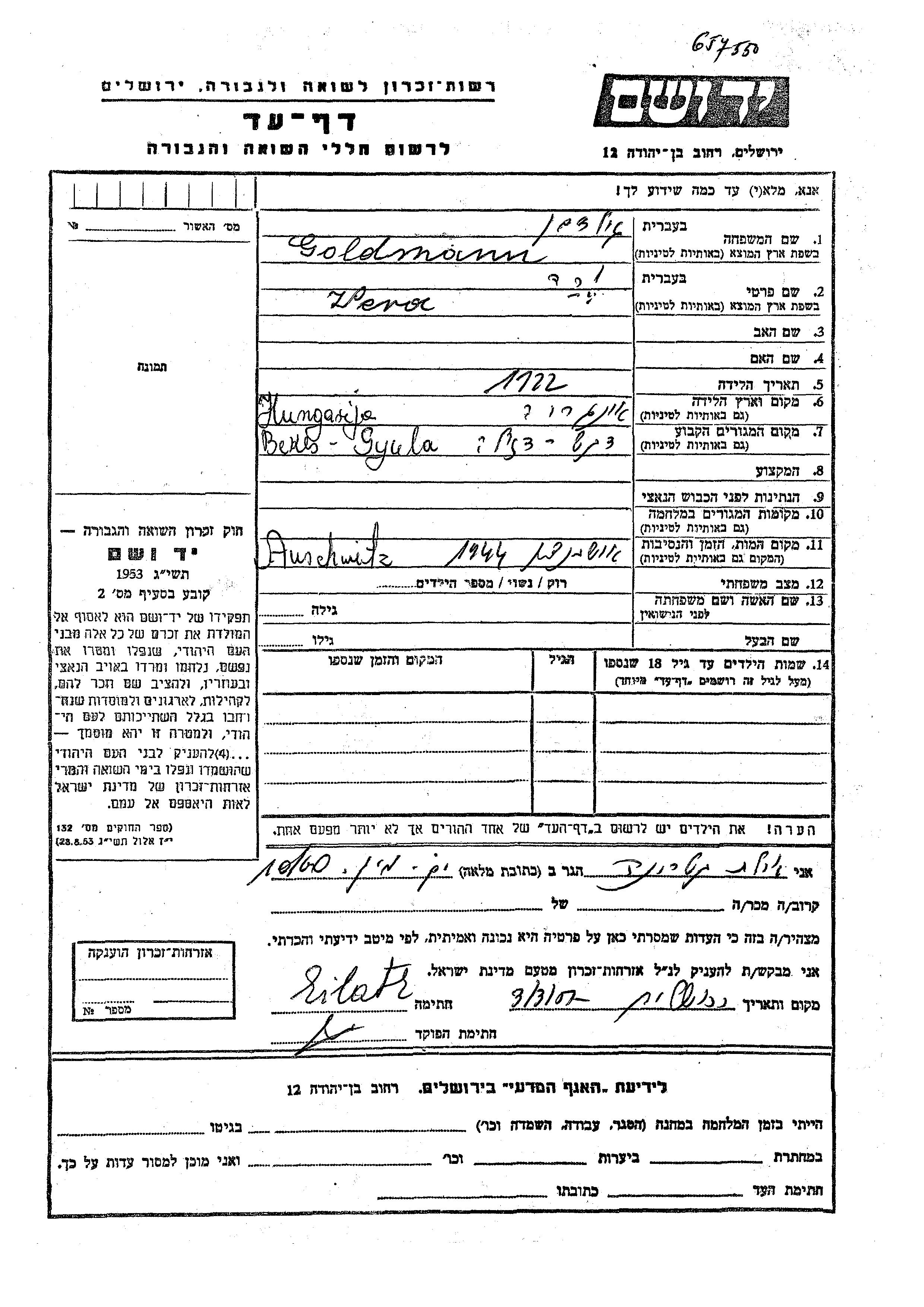 Goldmann Wera 1922 Bekes Gyula, Hongrie Feuille de témoignage