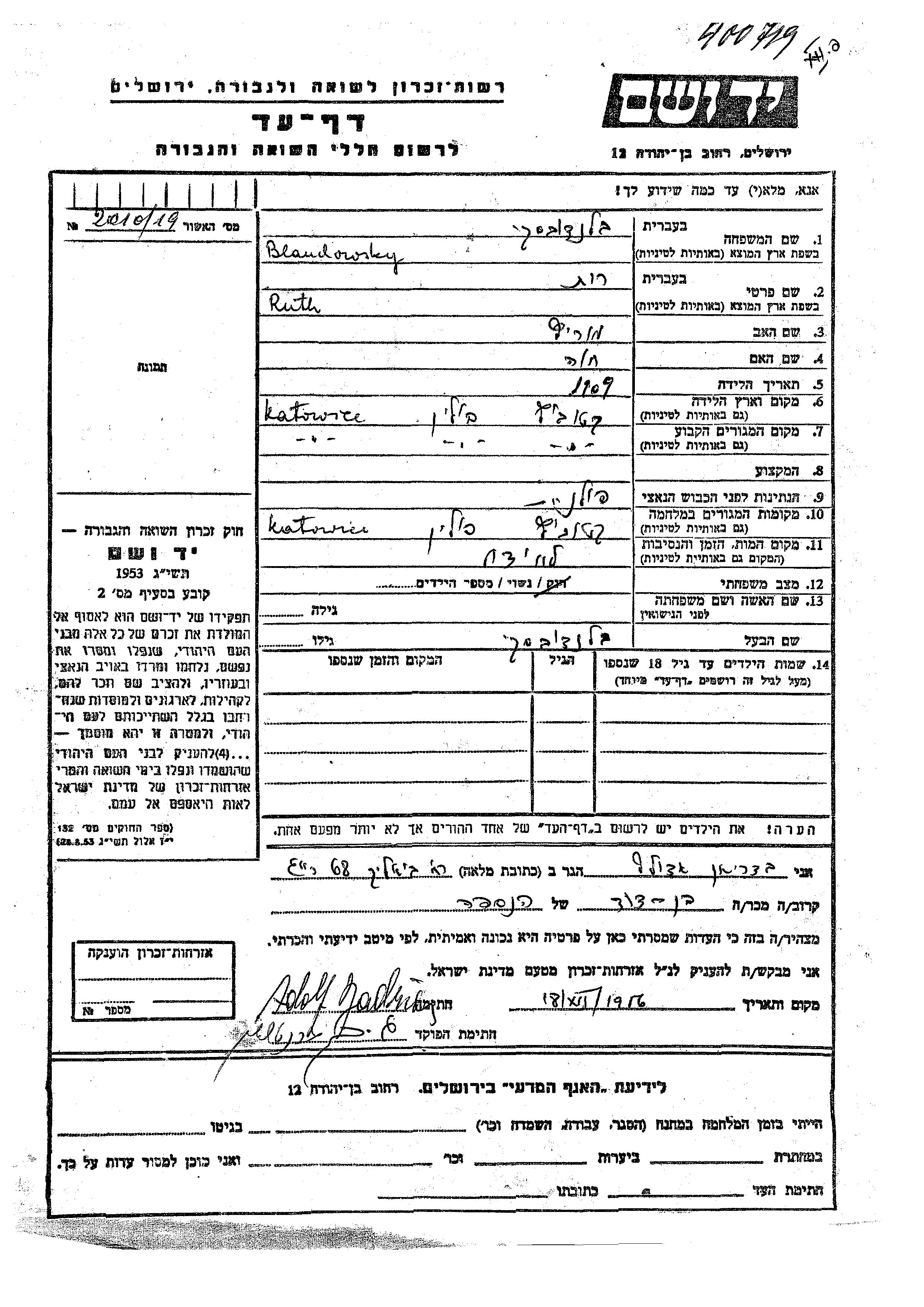 Blandovski Ruth 1909 Katowice, Pologne Feuille de témoignage