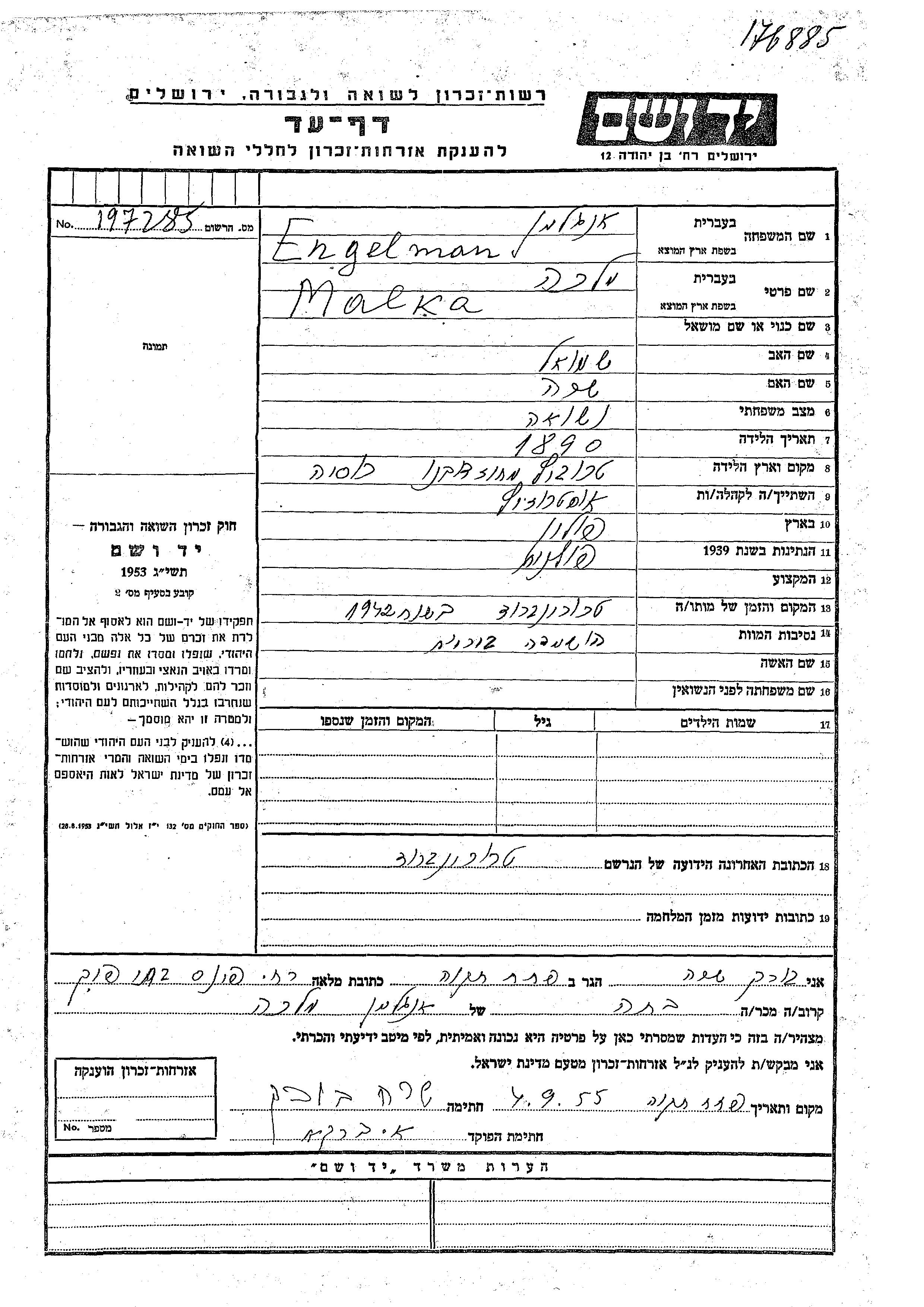 Engelman Malka 1890 endroit inconnu, Feuille de témoignage