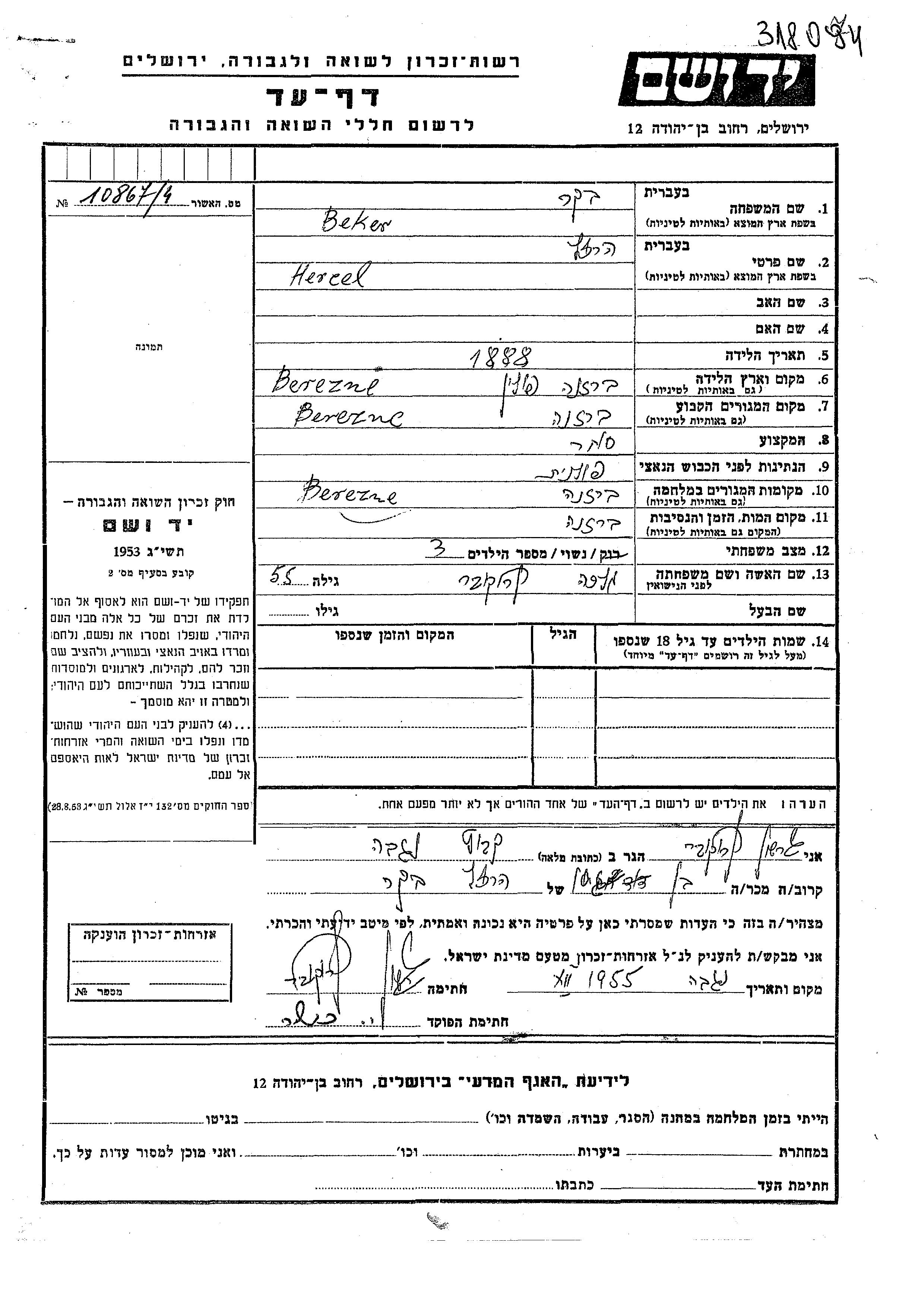 Beker Hercel 1888 Berezne, Feuille de témoignage