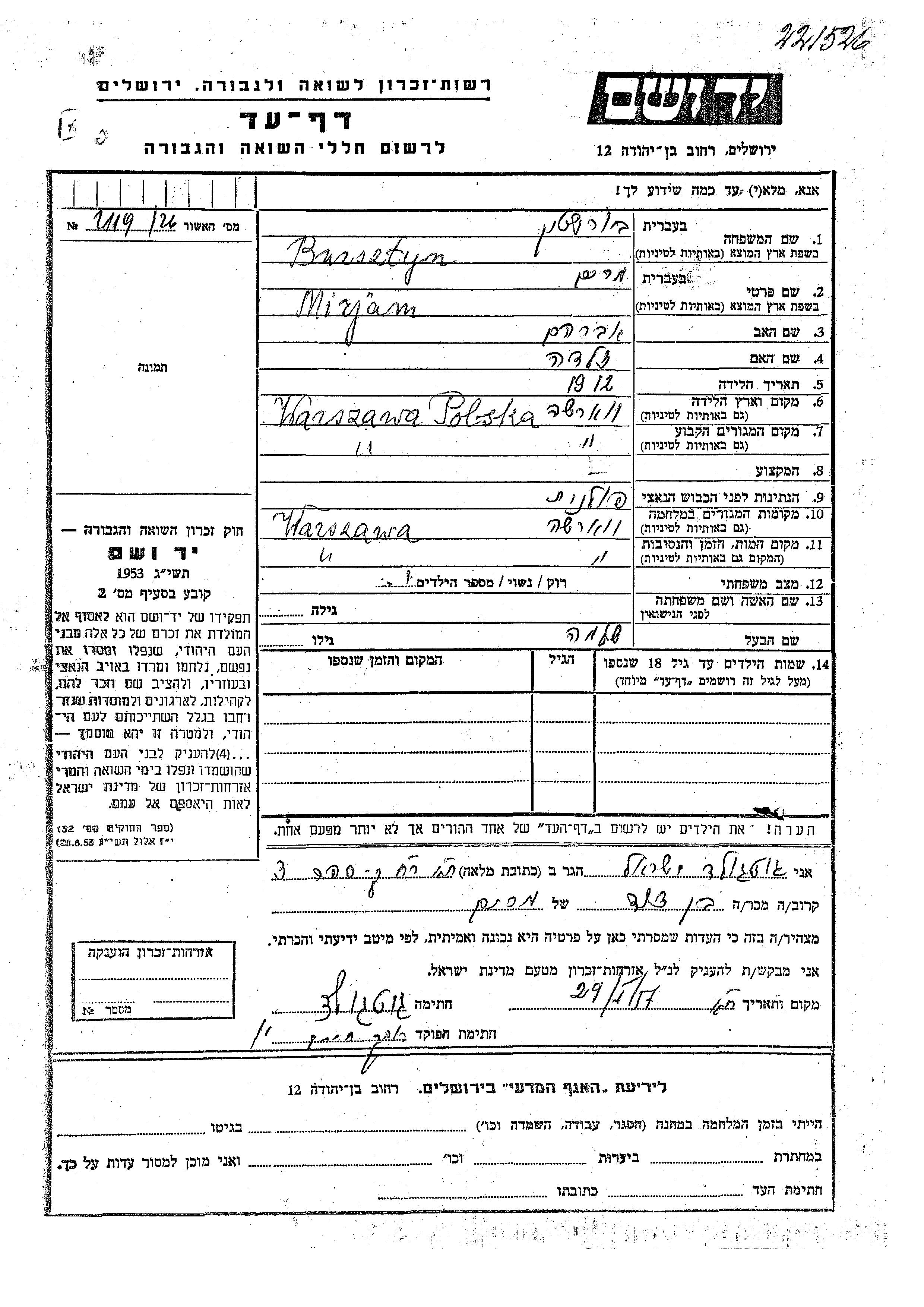 Bursztyn Mirjam 1912 Warszawa, Pologne Feuille de témoignage