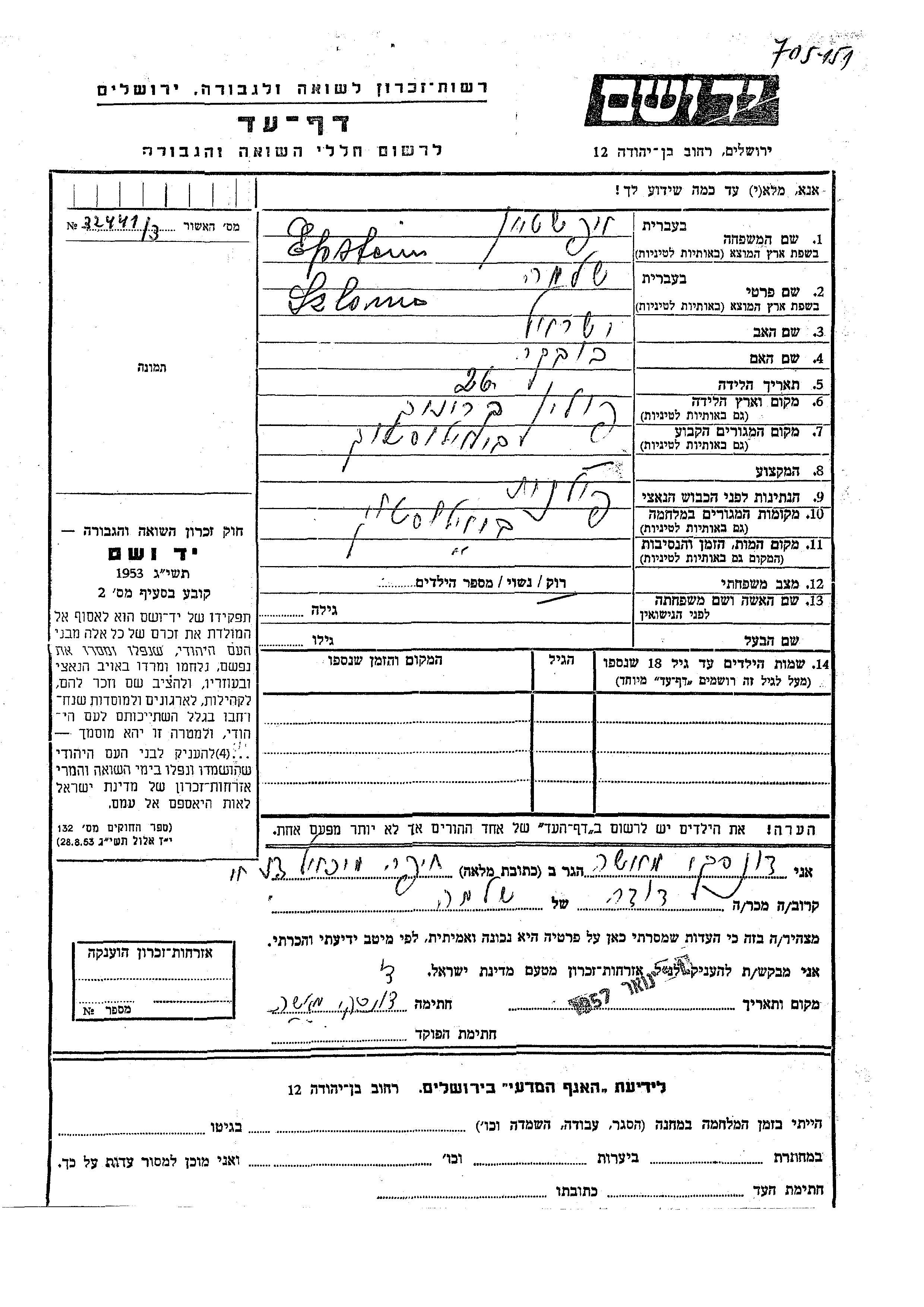 Epstein Szlomo Bialistok, Pologne Feuille de témoignage