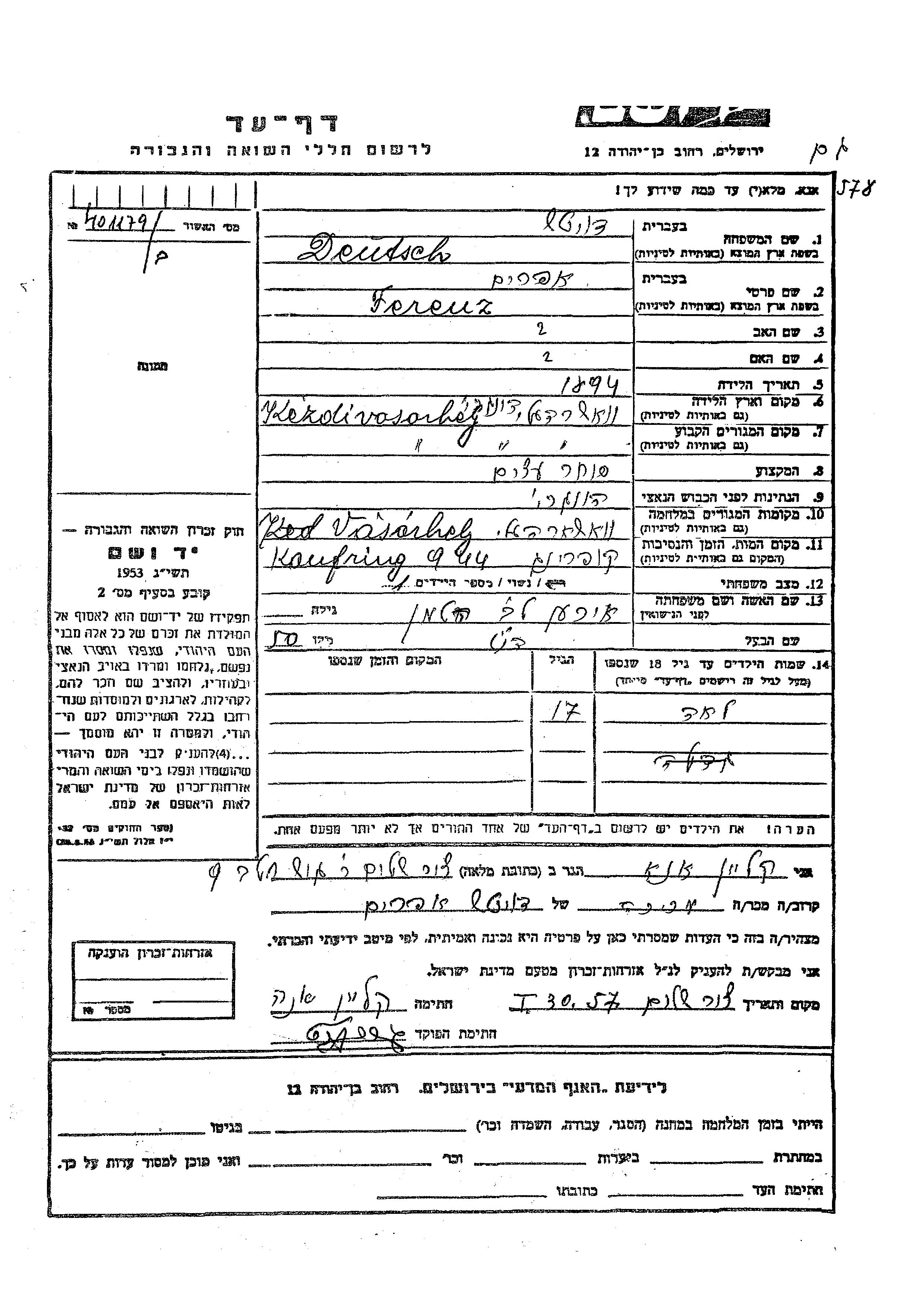 Deutsch Ferenz Efraim 1894 Kezdivasarhely, Roumanie Feuille de témoignage
