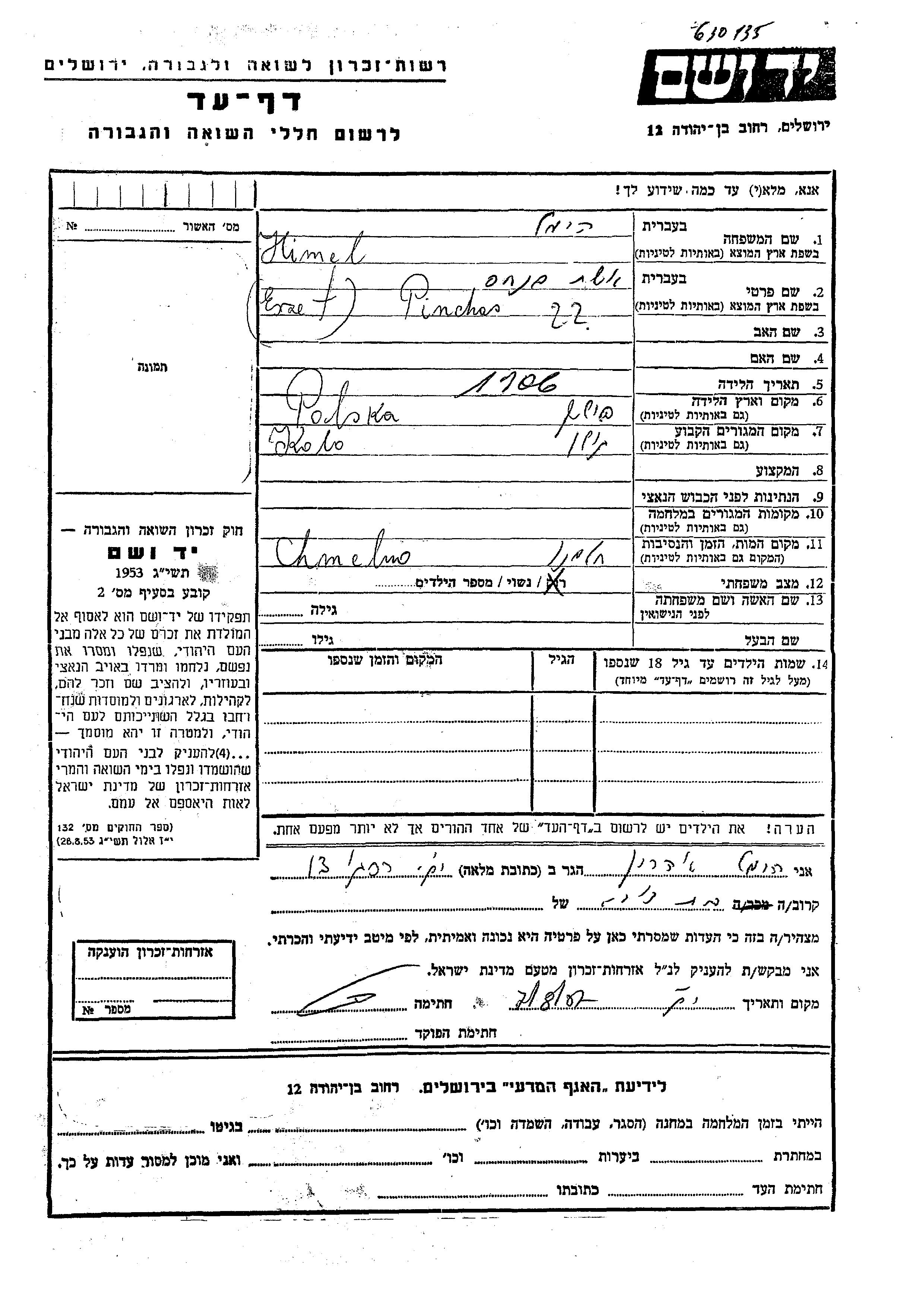 Pinchas Himel est né à Pologne en 1906. Il était Marié. Avant la seconde guerre mondiale il vivait à Kolo, Pologne.