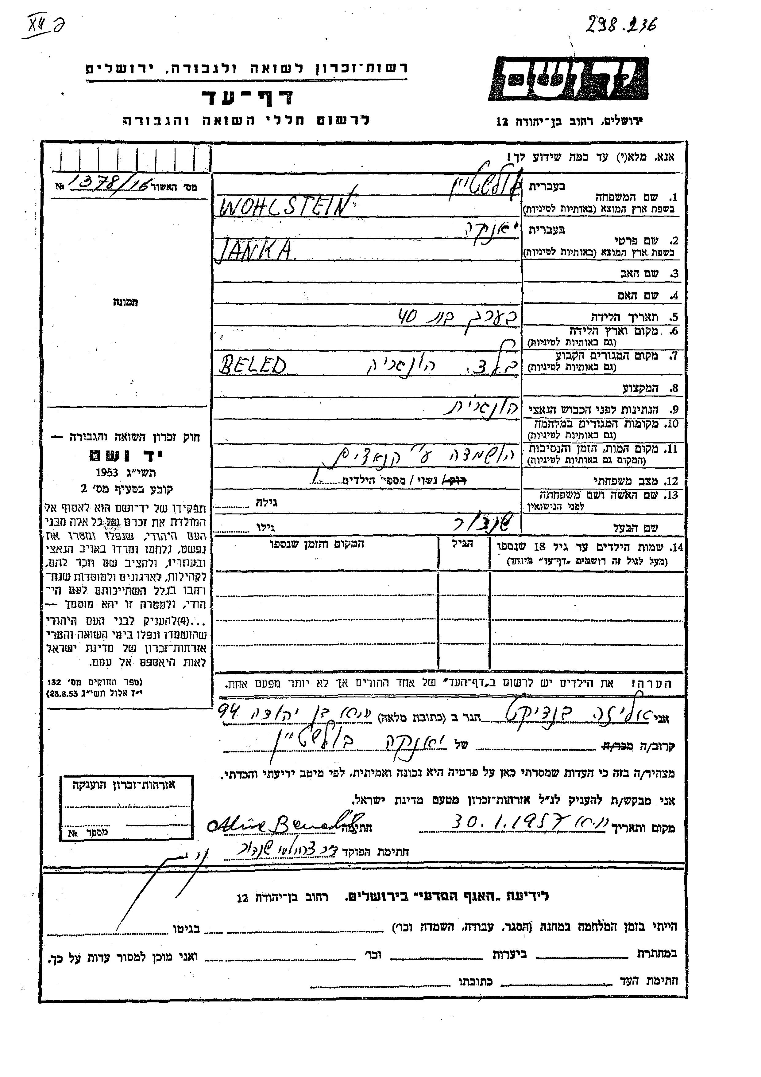 Wohlstein Janka Beled, Hongrie Feuille de témoignage