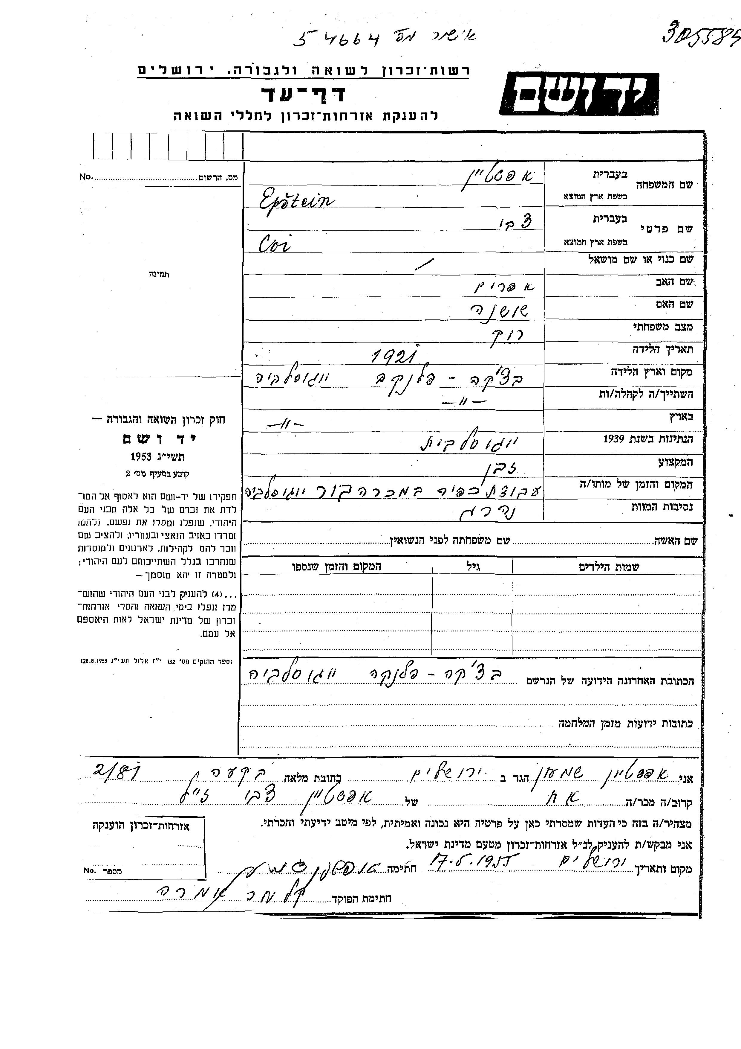 Cvi Epstein est né à Backa Palanka, Yugoslavie en 1921, fils de Efraim et de Shoshana. Il était Vendeur/vendeuse et Célibataire. Avant la seconde guerre mondiale il vivait à Backa Palanka, Yugoslavie. Au cours de la guerre, il était à Backa Palanka, Yugoslavie.