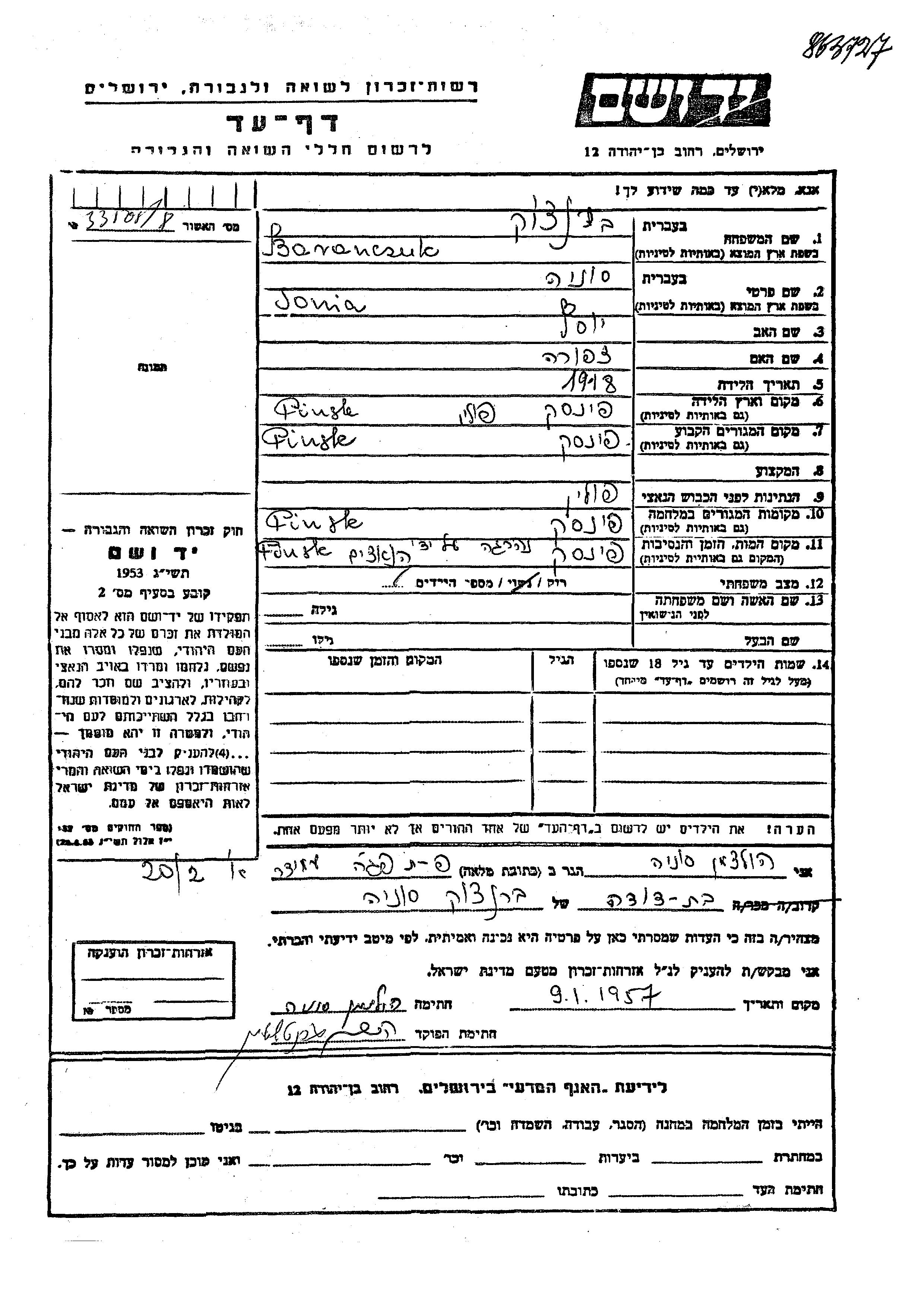 Baranczuk Branchuk Sonia 1918 Pinsk, Pologne Feuille de témoignage