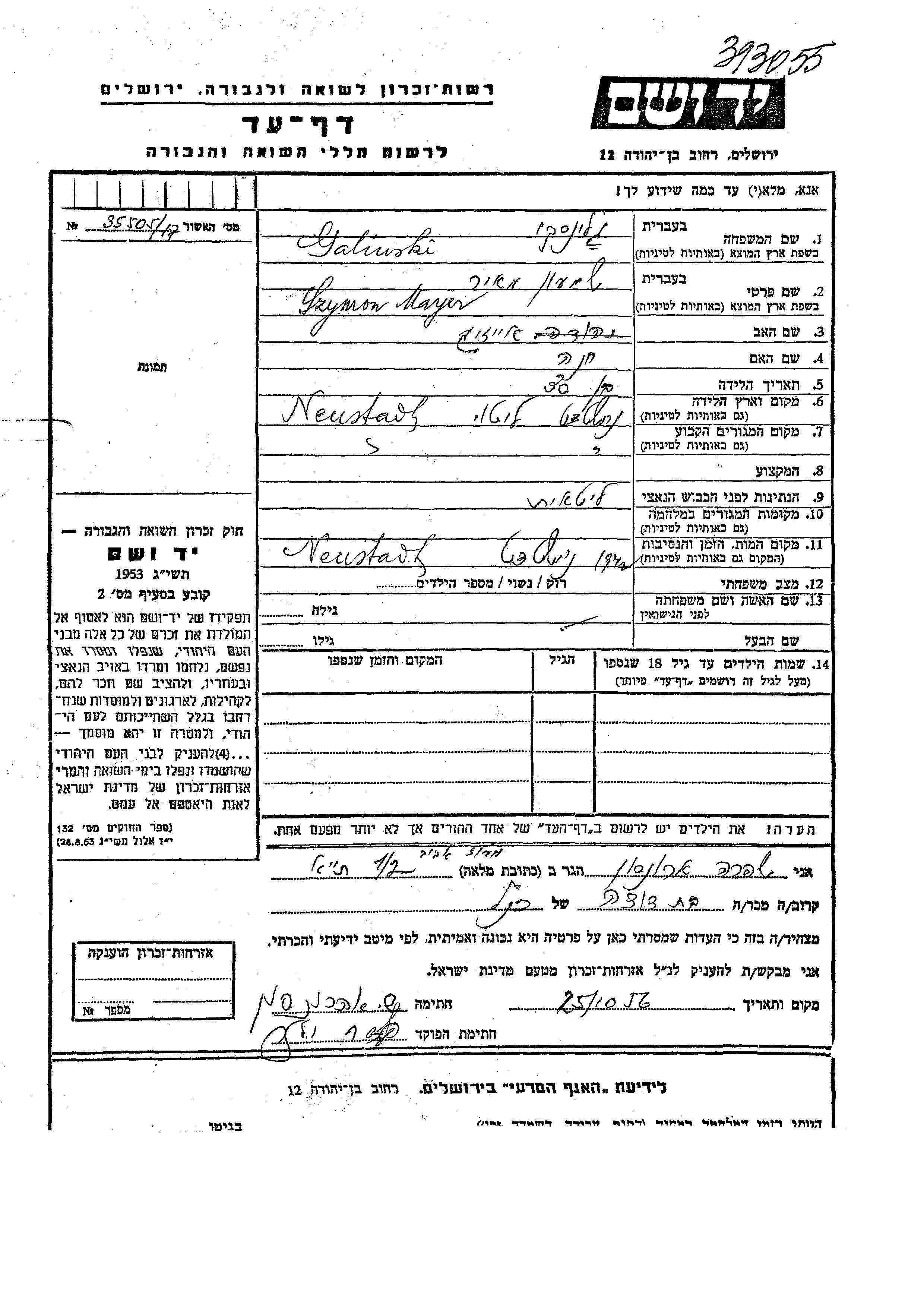 Yad Vashem - Pages of Testimony Names Memorial Collection