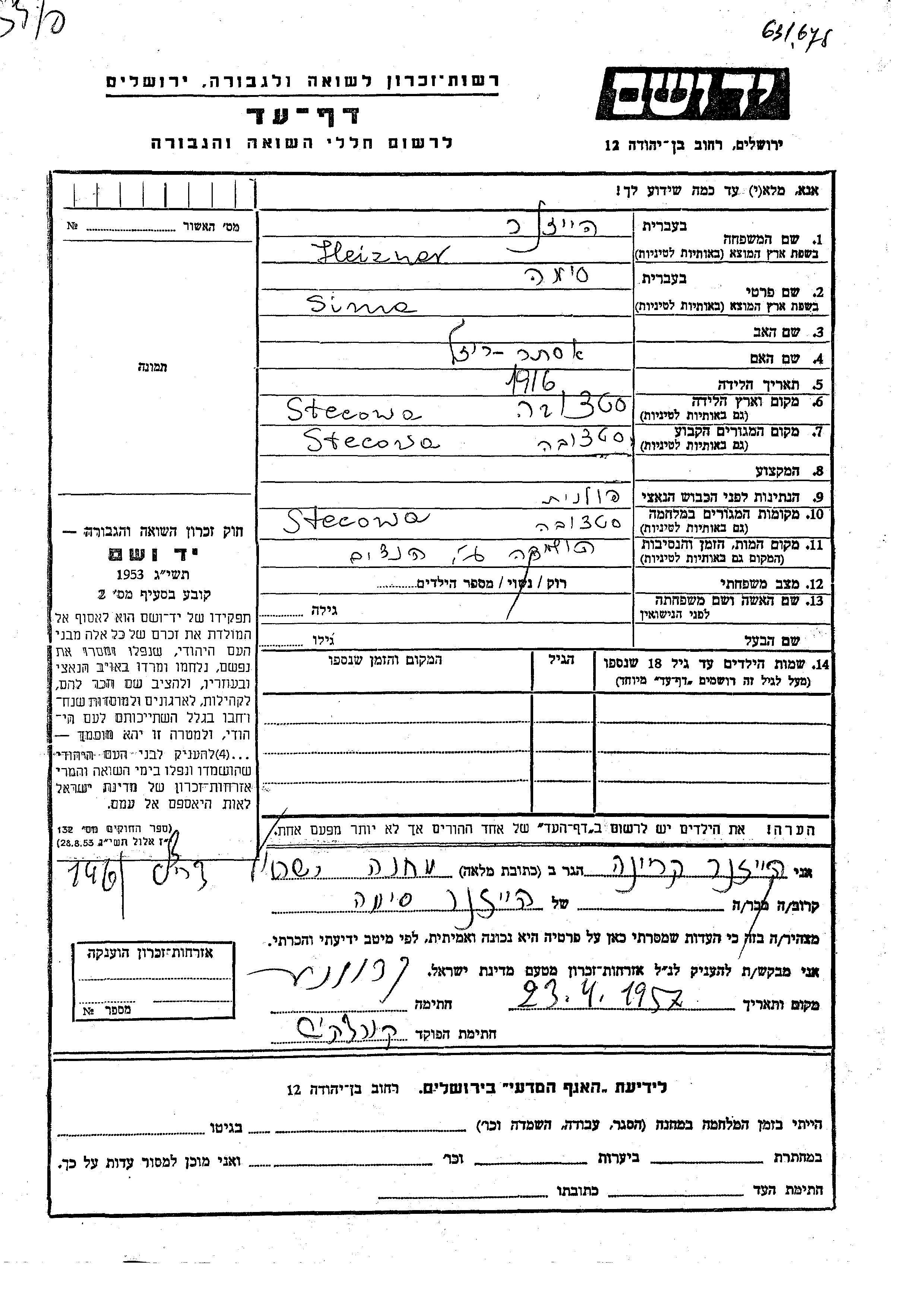 Heizner Sima 1916 Stecowa, Pologne Feuille de témoignage